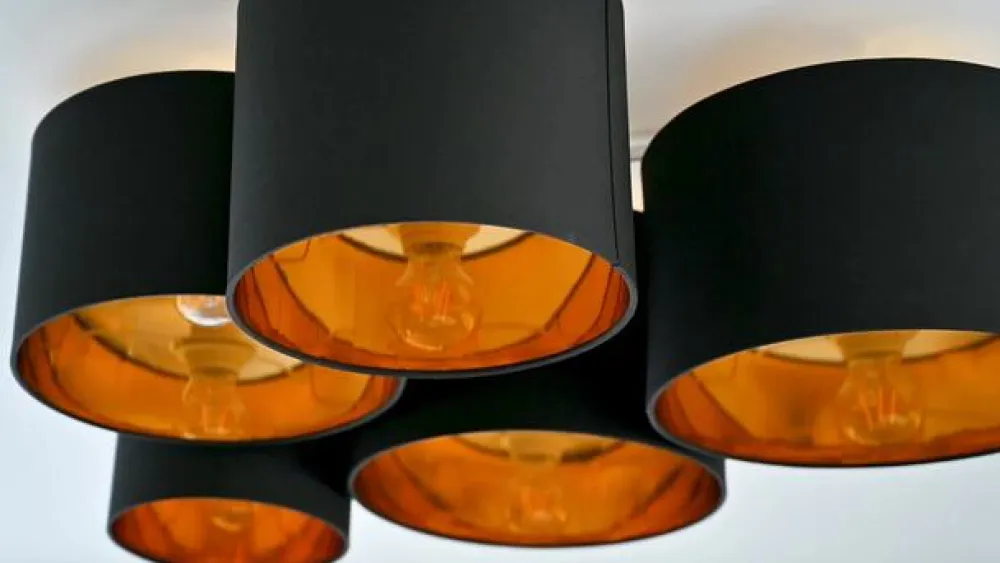Laurenz loftlampe med fem runde stofskærme i sort og guld Laurenz har fem lampeskærme i forskellige størrelser, der er sat sammen for at skabe et meget interessant, moderne look, som vil forbedre hjem og forretningslokaler. Hver skærm er rund og cylindrisk og er sort på ydersiden. Indersiden er derimod dækket af skinnende guldfolie, som ikke kun har en positiv effekt på udseendet, men også på lysmønstret, fordi lyset så reflekteres så smukt varmt. E27-lamperne kan vælges frit, og i versionen med 5 lyskilder kan Laurenz loftlampen give en god lysstyrke, så den sagtens kan bruges som hovedbelysning i rummet. Vi anbefaler især energibesparende LED-pærer, ofte i det populære filamentpære-look, som er inspireret af det klassiske glødepære-look.