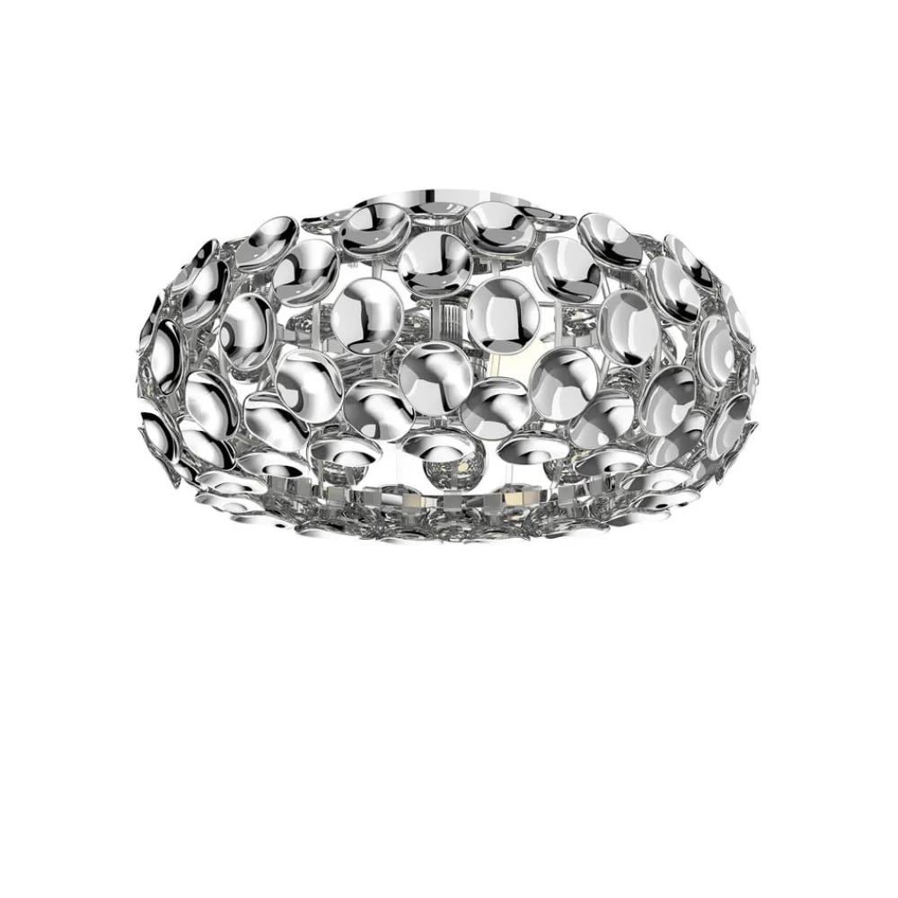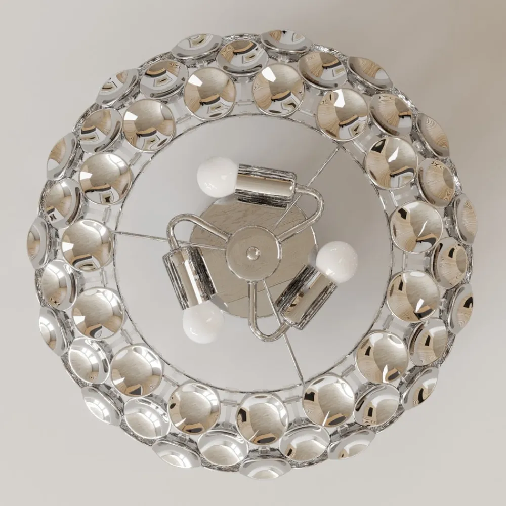 Funklende Reza loftlampe med mange blanke skiver i krom Reza har det helt særlige. Loftlampen består ikke af en konventionel, selvstændig skærm, men er sammensat af mange runde enkeltdele, som alle har en for- og bagside i højglans krom. Det skaber ikke kun en kølig elegance i en moderne stil, det giver også mulighed for mange lysrefleksioner, som så funkler og glitrer smukt. Nogle steder – hvor der er mellemrum mellem kromskiverne – kan lyset også slippe direkte ud, så lyset er et farverigt potpourri af forskellige effekter. Reza loftlampen kan integreres på mange forskellige måder i opholdsrummet. Den er ikke kun velegnet til opholds- og spiseområdet, men ser også godt ud i soveværelset eller som belysning i gangen.