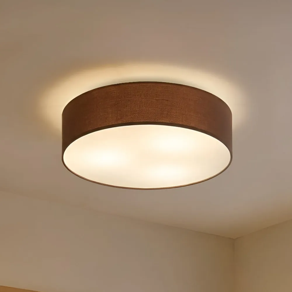 Sebatin loftlampe i brun til E27-lamper Brun er en smuk farve, som bliver mere og mere populær, og som falder i god jord, når det gælder indretning af boligarealer. Lyset fra Sebatin loftlampen er varmt og hyggeligt. Ydersiden af skærmen er lavet af brunt stof, undersiden er også stofbeklædt, men her med en hvid overflade, så der stadig kan slippe tilstrækkeligt med lys ind i boligarealet. Lampen kan monteres med E27-pærer.