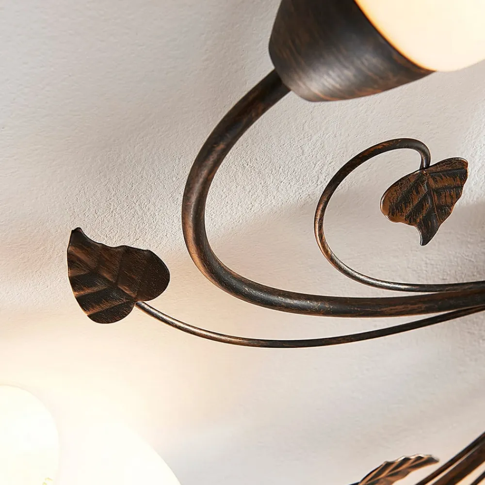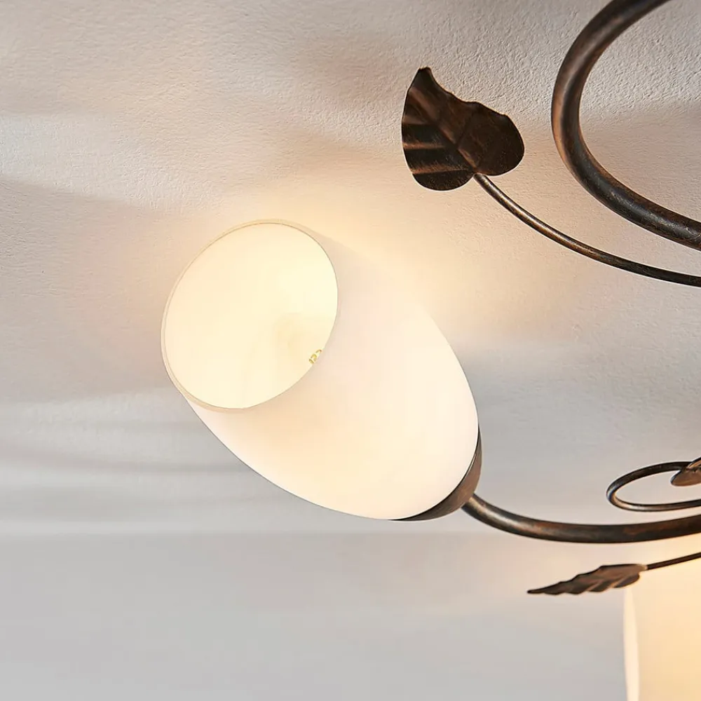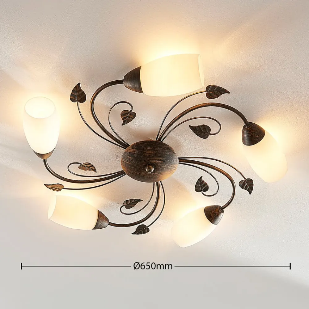 Stefania loftlampe i romantisk landhuslook Stefania har et smukt ensartet udseende og består af en metalramme og fem glasskærme. Landhusstilen dominerer udseendet på denne loftlampe, da rammen har fine bladdekorationer, er udført i sort og også har fine gyldne penselstrøg på overfladen, som giver en særlig elegance og også forstærker det antikke look.