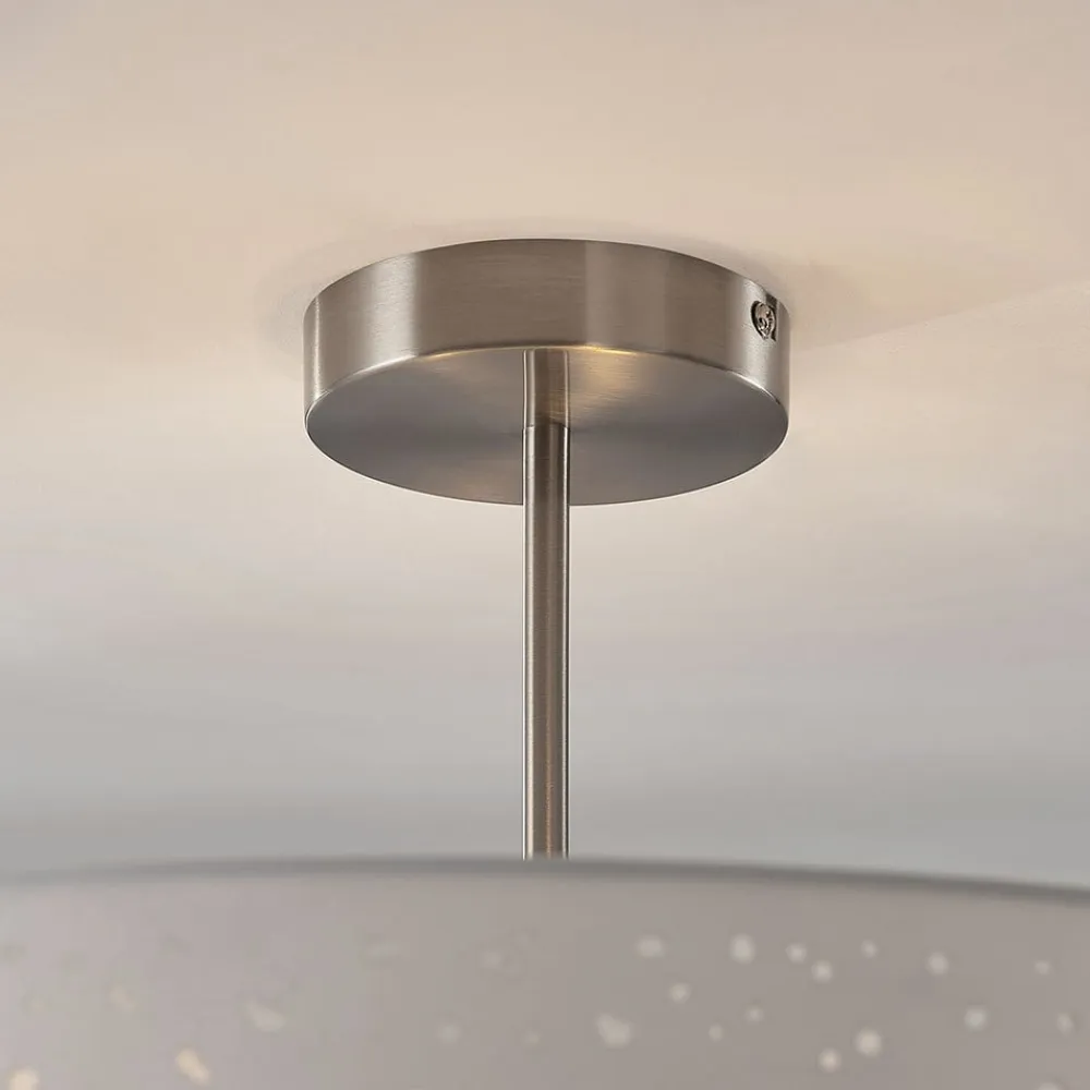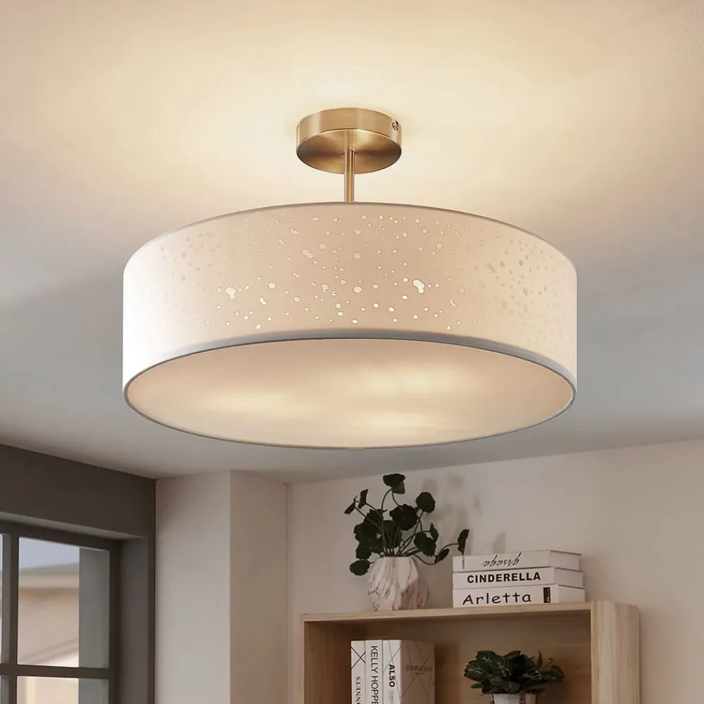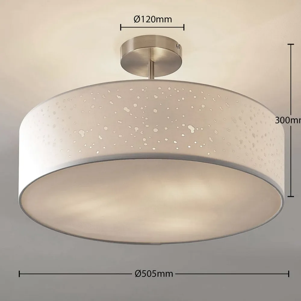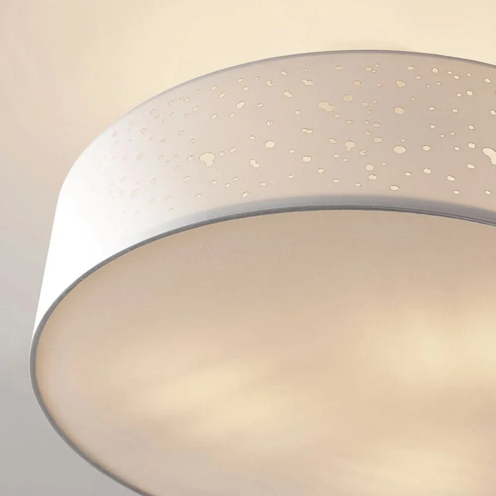 Umma loftlampe med hvidt stofdesign og iøjnefaldende laserskåret hulmønster Umma loftlampen har en rund stofskærm i tidløs hvid, der skaber en smuk lyseffekt med bløde effekter. Lampeskærmen er placeret i en lille afstand fra loftet, og ud over den hvide overflade er den prydet med utallige små huller, der er skabt med en laser og skaber mange små områder, hvor lyset kan trænge udad med større lysstyrke. Den hvide diffusor på undersiden giver et blødt, jævnt stjernehimmel, som er ideel til Schöner Wohnen.