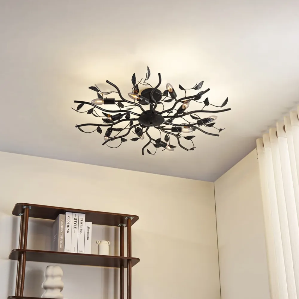 Sort-gylden loftlampe Yos med bladlignende dekor og ti E14-fatninger