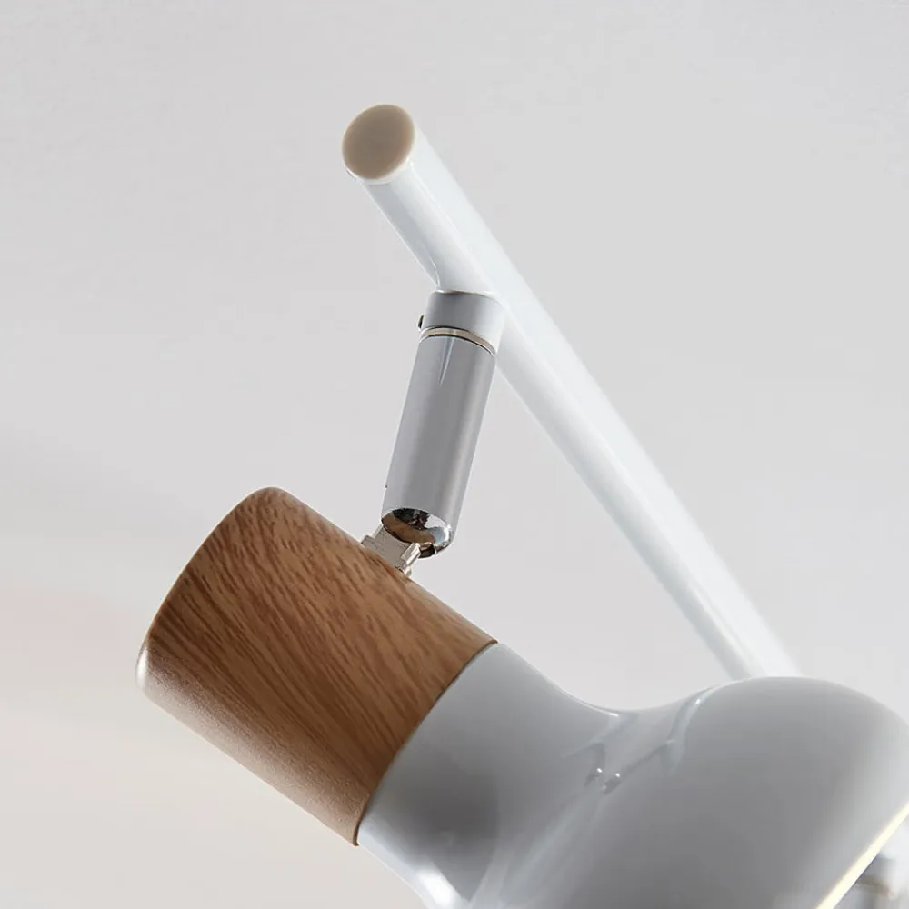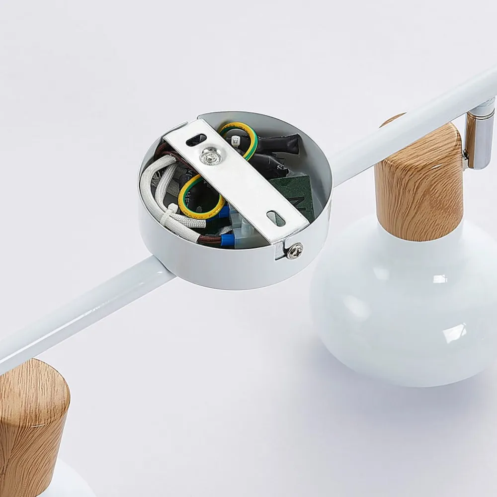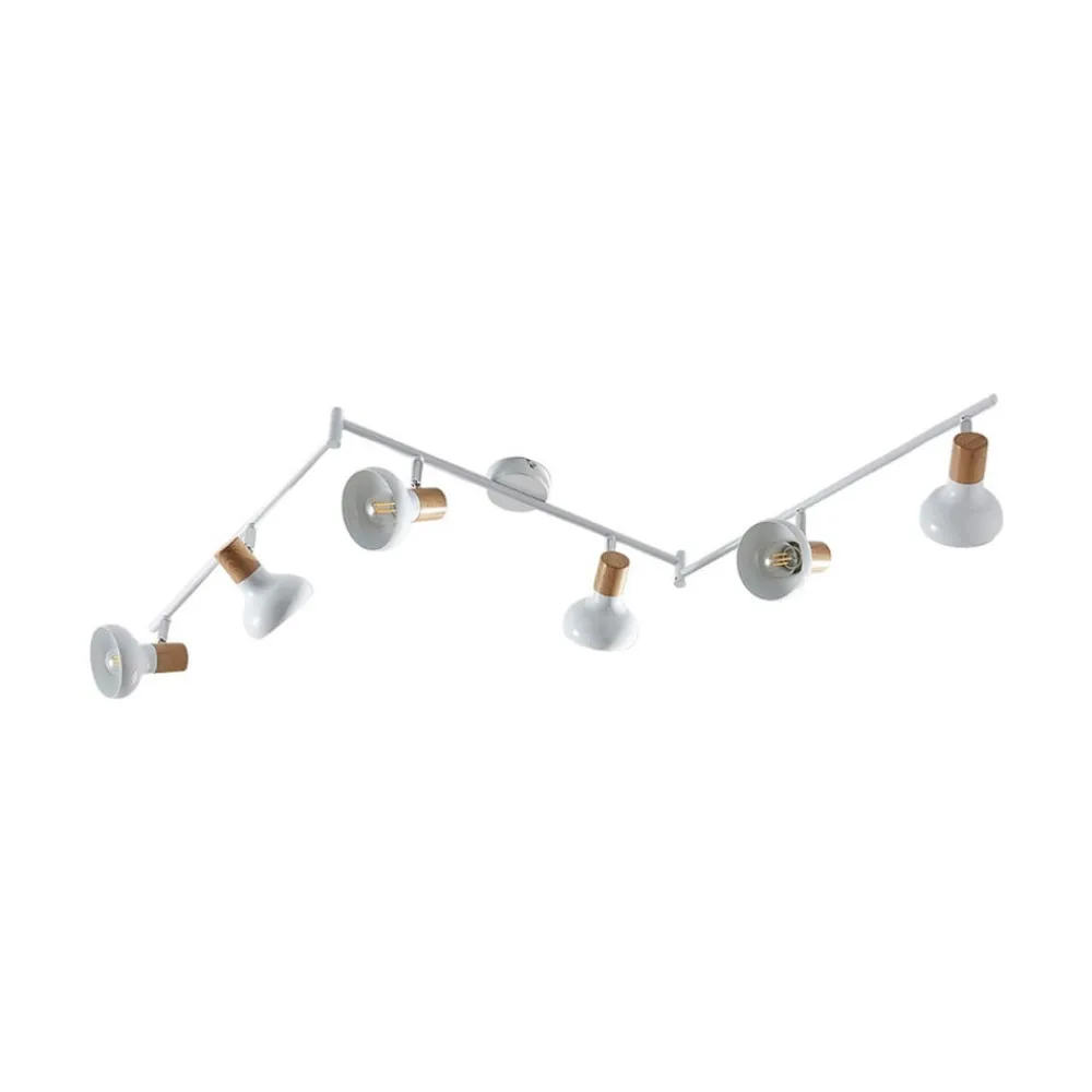 Til lysende rumbelysning: Fridolin loftspot med seks hvide metalskærme Denne spotlight er designet til montering i loftet og har to sidearme ud over midtersektionen, som hver holder to skærme, så der i alt er 6 lampeskærme fastgjort til rammen. Skærmene er lavet af metal og er smukt udformet. Størstedelen er holdt i en diskret hvid, kun den øverste del har en træfarvet finish, som skaber en smuk, men venlig kontrast. 6 lyskilder-versionen af loftspottet kan bruges rigtig godt som hovedbelysning, hvilket også gælder for større opholdsrum, fordi leddene gør det muligt at justere lyset variabelt, og det er også muligt at belyse mere afsidesliggende hjørner godt.