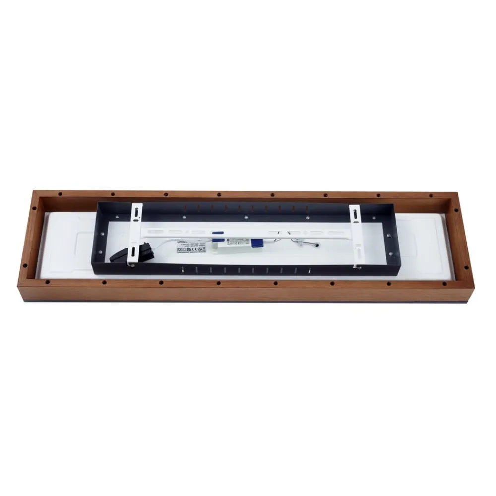 Rektangulær Laviona LED-loftlampe med trædekor til moderne opholdsrum Laviona kommer i et rektangulært design og imponerer med sit stilfulde hus i metal og træ. Med sit lineære look passer denne flade LED-loftlampe meget godt ind i moderne boligområder og kan også bruges i en gang med sine kraftige LED’er. Den spotlighter et behageligt lys med en varmhvid lysfarve og giver en god stemningsbelysning i rummet.