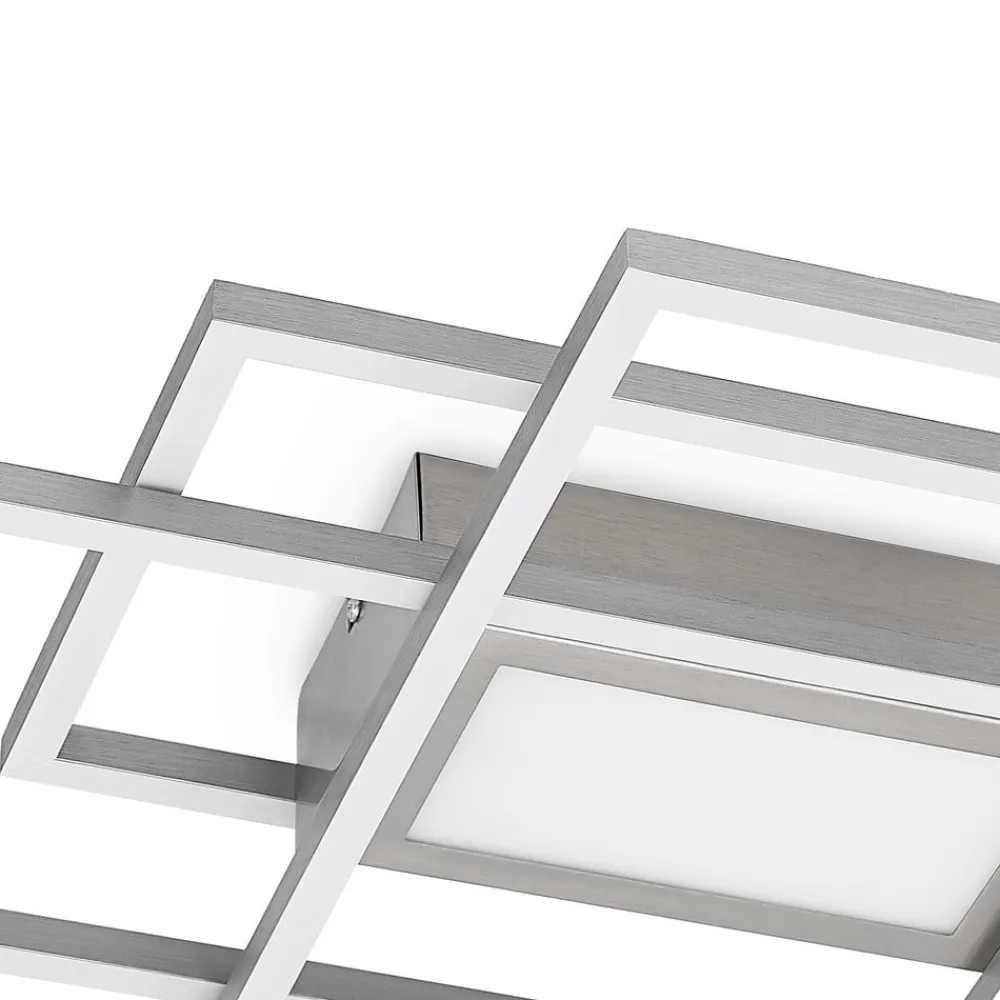 Caitlin nikkelfarvet LED-loftlampe i et legende design LED-loftlampen Caitlin imponerer med sit moderigtige design og interessante udseende. Den består af tre rektangulære rammer, som er fastgjort til et loftbeslag over hinanden og overlapper hinanden. Inde i disse elementer er der permanent installerede LED’er, som giver det tilsvarende lys. Lysfarven kan nemt styres fra 3.000 K til 6.000 K ved hjælp af en fjernbetjening. Det giver altid det rigtige lys på det rigtige tidspunkt. Med sit diskrete farveskema og attraktive design kan LED-loftlampen Caitlin uden problemer integreres i moderne indretningsstile og supplerer møblerne smukt. Med sin store størrelse spreder den lyset bredt i hele rummet og skaber en harmonisk atmosfære.