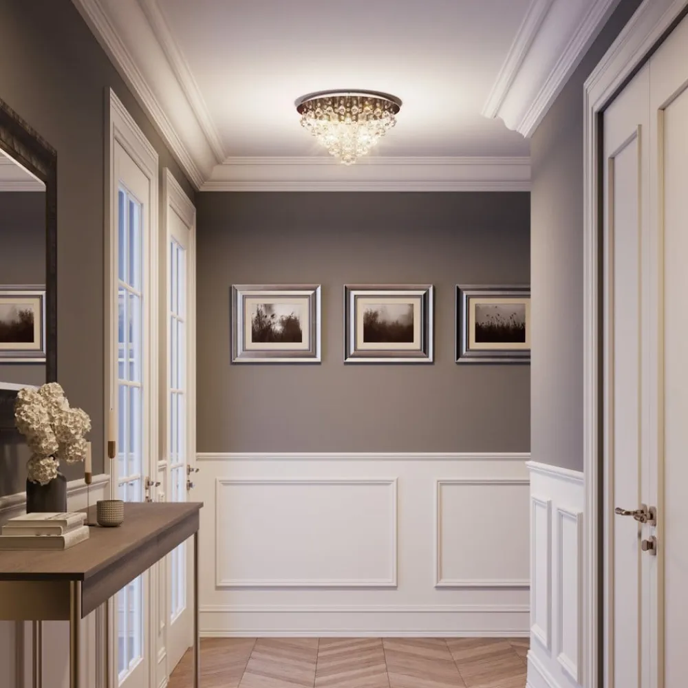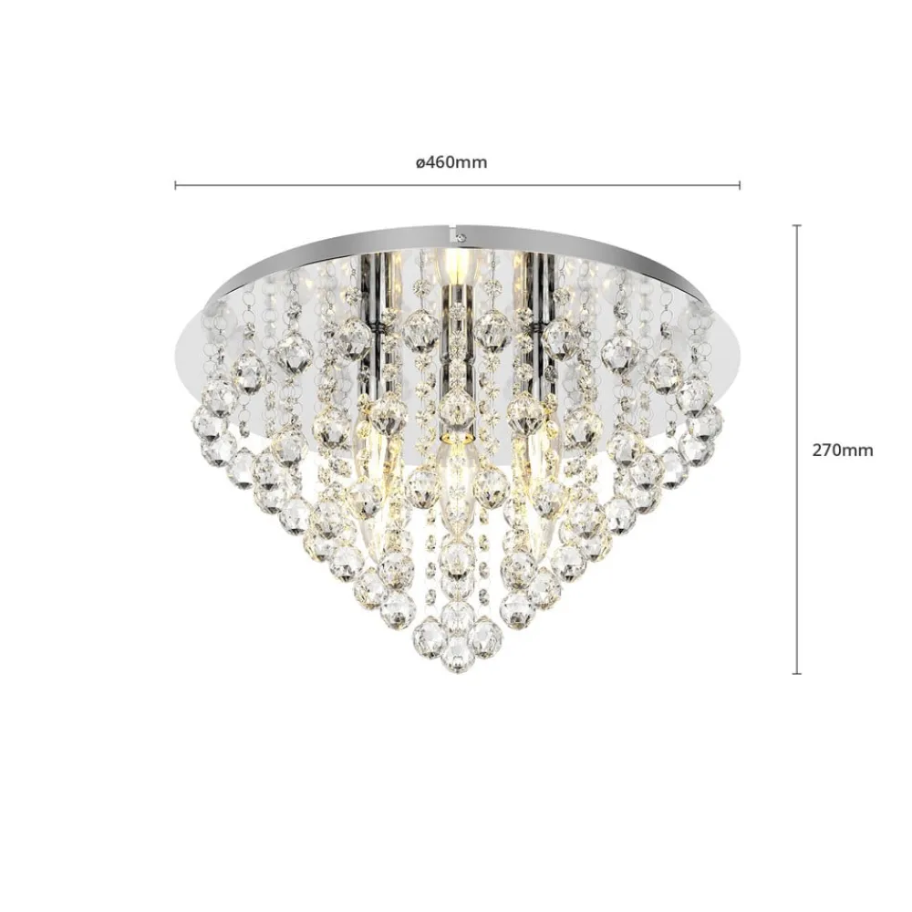 Annica loftlampe med forkromet loftplade og glitrende akrylpendel Annica bringer en særlig glamour til moderne boligområder, da akrylelementerne er smukt polerede og derfor har utallige klare kanter til at reflektere lyset. Dette skaber et fortryllende glitter, når loftlampen er tændt, som normalt opfattes som noget meget glamourøst i hele rummet og desuden reflekteres af den forkromede overflade.