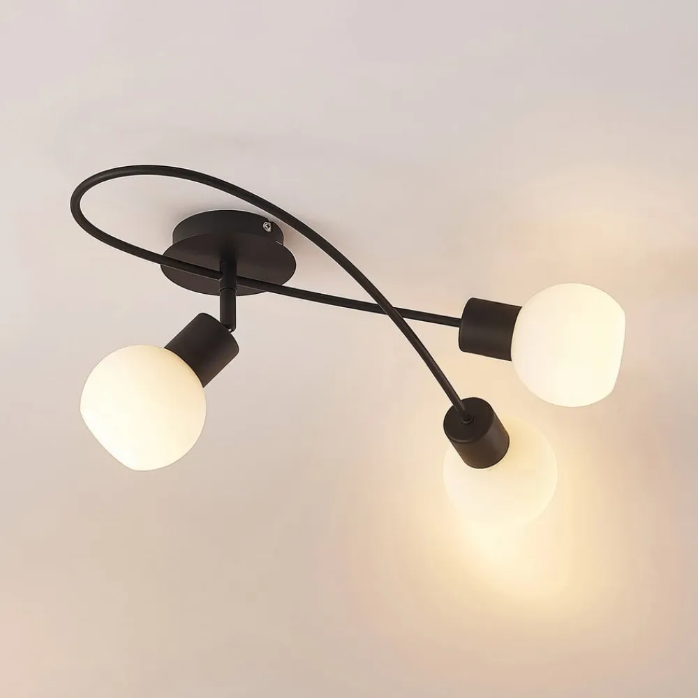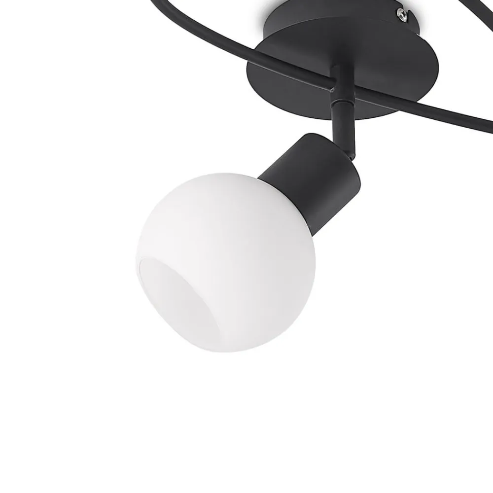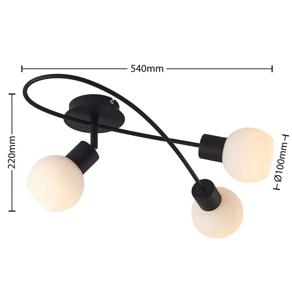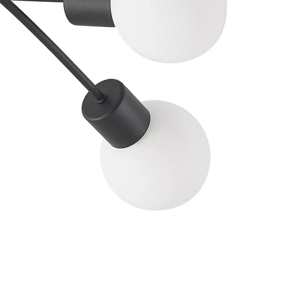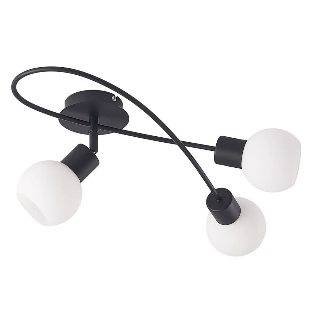 Elaina loftlampe med en smuk farvekontrast mellem sort og hvid Denne loftlampe skiller sig ud med sit farveskema og tiltalende design. Rammen er lavet af jern, og overfladen er udført i en klassisk sort farve. De tre lampeskærme af opalhvidt glas danner en elegant kontrast. Det overordnede koncept for Elaina-loftlampen er harmonisk og stilfuldt. Denne lyskilde passer godt ind i moderne indretninger og kan bruges i mange forskellige rum.