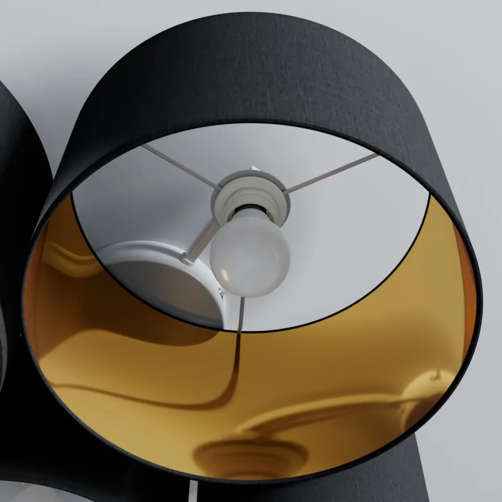 Sort og guld, 4 lyskilder Laurenz loftlampe med cylindriske stofskærme i forskellige størrelser Laurenz skaber en hyggelig stemning i hele opholdsrummet. Loftlampen har fire matsorte stofskærme, der er forskellige i størrelse og er foret på indersiden med en skinnende guldfolie. Det skaber en meget iøjnefaldende kontrast, som er en af tidens trends, og giver et varmt lys. Der kan sættes en E27-pære i hver stofskærm. Effektive LED-pærer anbefales især, og en ekstra varm lysfarve kan også anbefales til hyggelig belysning i stuen. Hvis du vil, kan du også vælge dæmpbare lamper, hvoraf nogle endda kan justeres gradvist i lysstyrke via vægkontakten uden en almindelig dæmper. Laurenz loftlampe er ikke kun velegnet til private hjem, men giver også en smukt indbydende belysning i kommercielle områder som hoteller og restauranter.