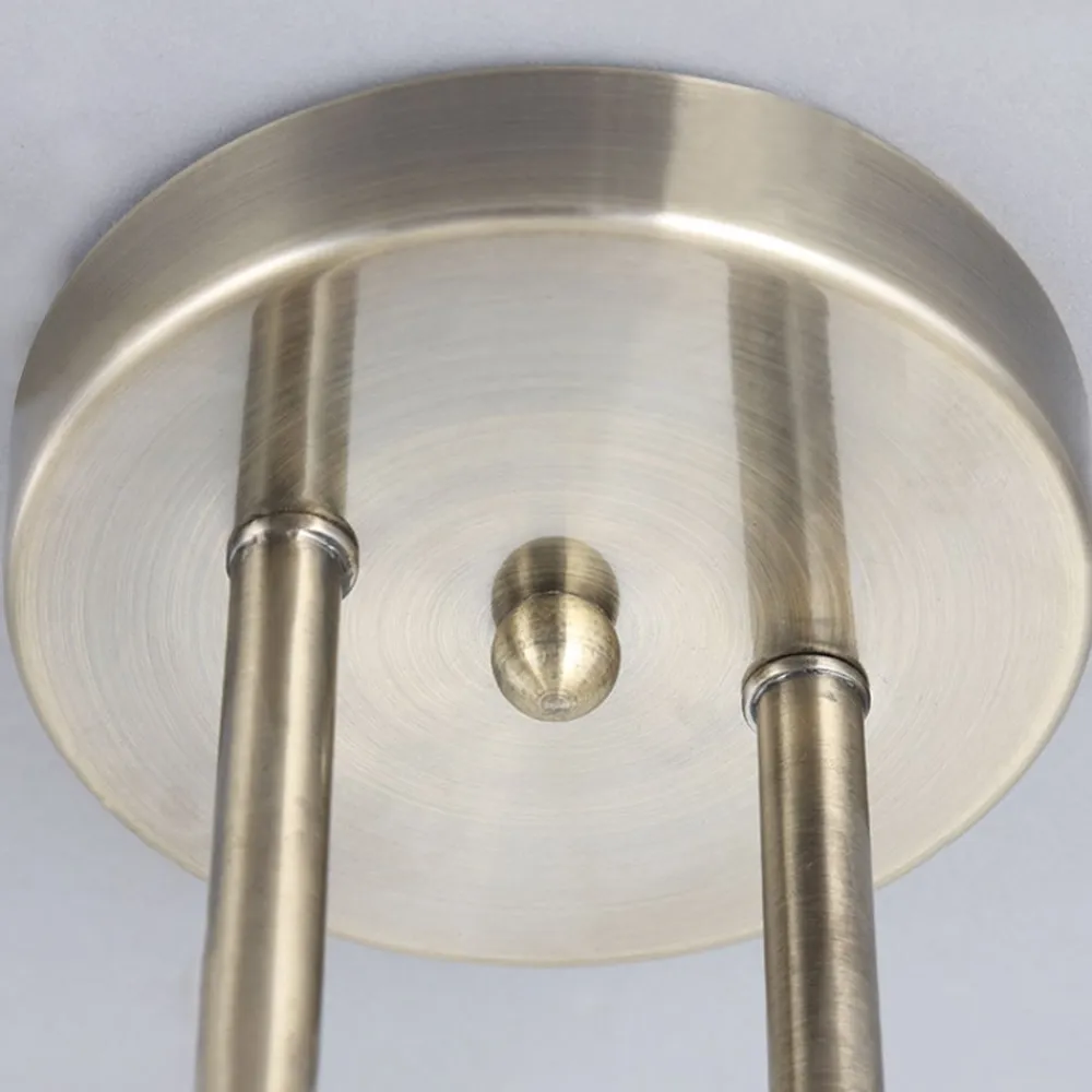 Attraktiv Leanda loftlampe med fire glaskugler og en ramme i antik messingfinish Leanda kombinerer klassiske designelementer med et moderne udtryk. Glasskærmene er åbne i bunden. Rammen består af flere bølgede stivere og er belagt med en antik messingfinish. Skærmene er arrangeret i en linje, hvilket har den fordel, at de kan oplyse et relativt stort område. Leanda er et særligt godt valg som belysningselement ved spiseborde.