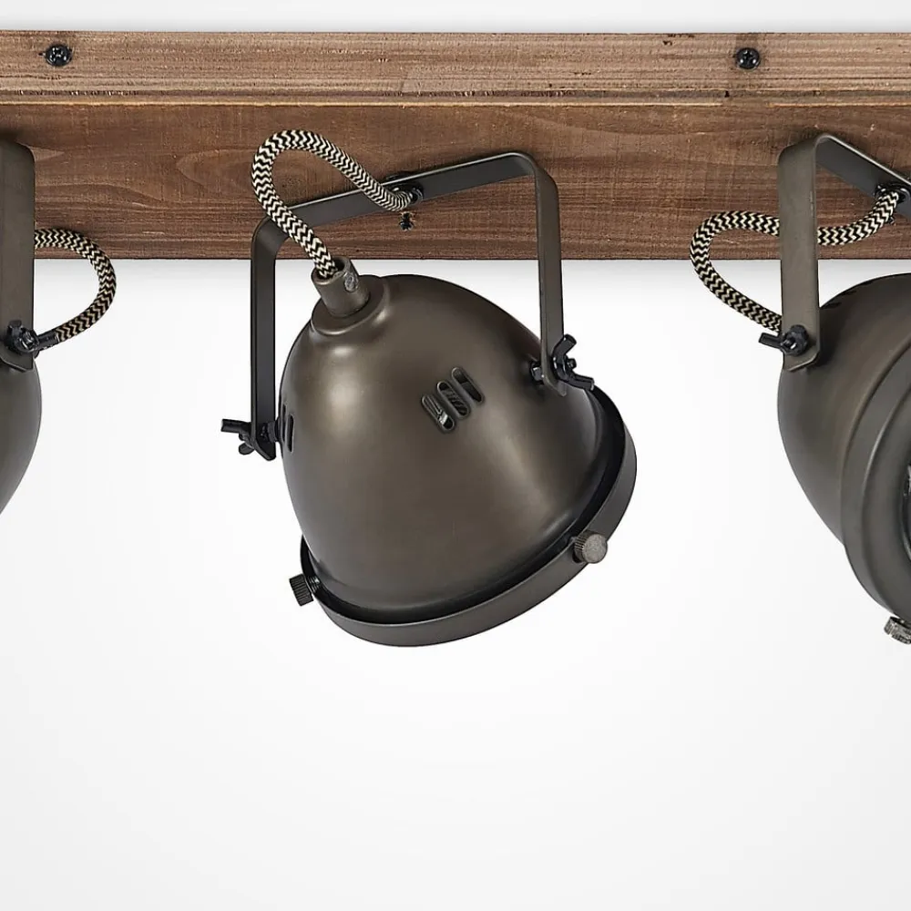 Farovi loftspot med baldakin og tre sorte spotlights Designet af de tre lampeskærme i Farovi loftlampen minder om forlygterne på en klassisk bil takket være deres form, sorte farve og klare glasdæksel med riller. De kan drejes og svinges i de beslag, som de er fastgjort til baldakinen med, så forskellige områder i stuen, gangen eller soveværelset kan fremhæves specifikt. Det industrielle designlook understreges yderligere af den lange baldakin med en meleret finish.