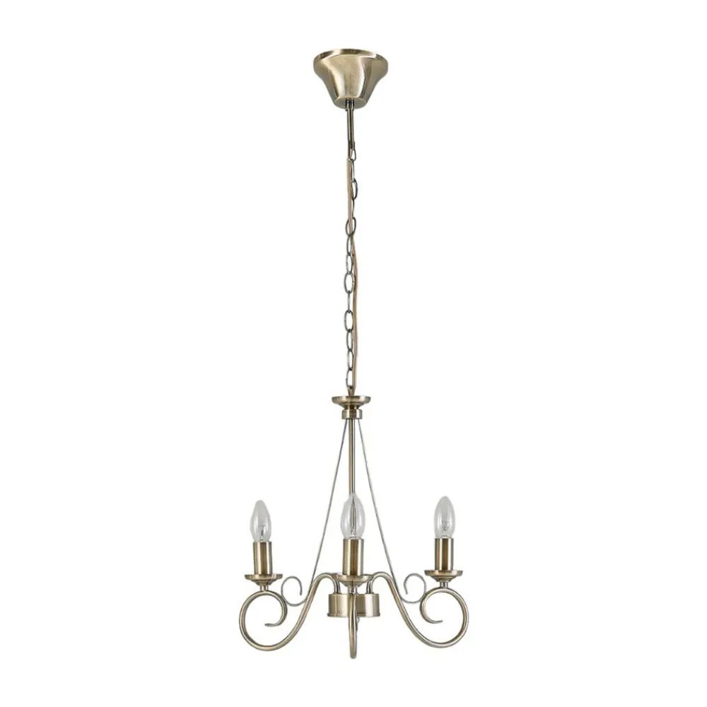 Smuk Marnia lysekrone i antik messing i en 3 lyskilder version Alt ved denne lysekrone ser elegant og sublimt ud, hvilket gør den til en fantastisk tilføjelse til spise- og opholdsområder, som straks ser lidt mere glamourøse ud i Marnia’s lys. Hele rammen er udført i antik messing: fra lysestagerne til lampearmene og midten til kæden og loftsophænget. Det skaber et harmonisk samspil, der kan sidestilles med elegance og stilfuldt udtryk. Lampearmene i metal ligner romantiske ranker, fordi de er så smukt snoede og derfor ser lidt mere legende ud.