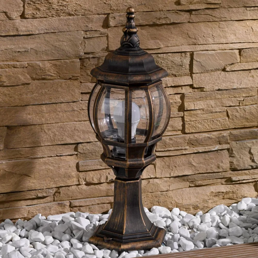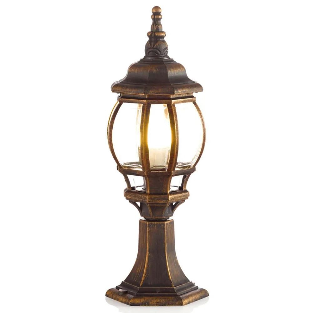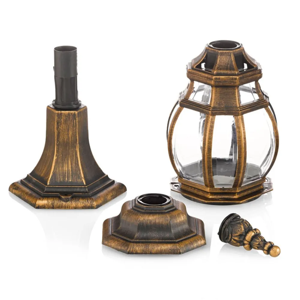 Gylden Nadesha sokkellampe med orientalsk flair – IK06 slagfasthedsklasse, saltvandsresistent Nadesha sokkellampen har et saltvandsresistent plasthus, der er tonet gyldent, hvilket giver den et varmt, antikt look. Det overordnede design med dets udsmykkede udseende og kurver minder om en orientalsk stil og lysene fra 1001 nats eventyr. Takket være de klare indsatser er pæren tydeligt synlig og bør derfor vælges, så den fremstår særligt stilfuld. Det gælder især LED-filamentpærer med et rustikt look. Sokkellampen kan placeres på vægge eller andre forhøjninger og er altid et blikfang med en æstetisk appel.