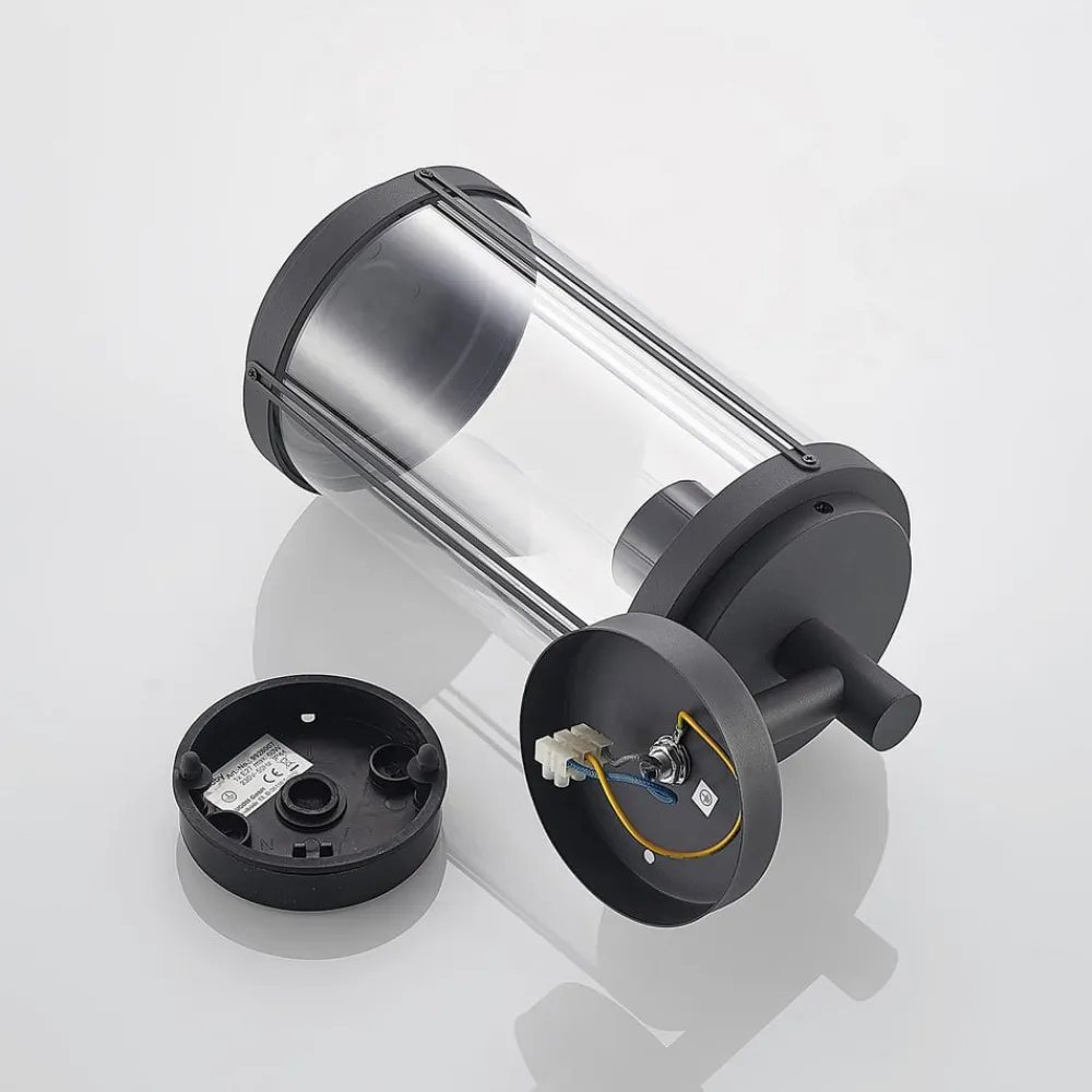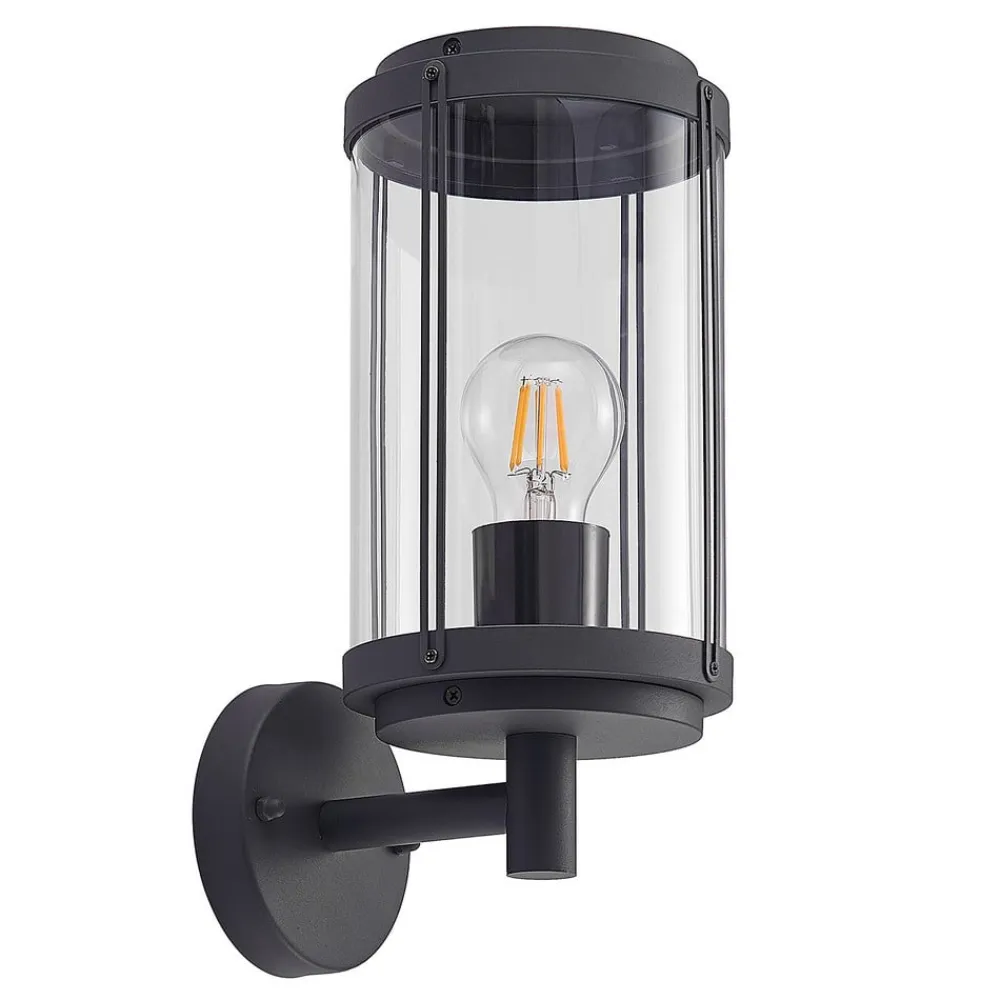 Mørkegrå Ojali udendørs væglampe med en lampeskærm af polykarbonat Ojali udendørs væglampen har et rundt vægbeslag, hvorfra der udgår en filigran lampearm. På denne er der monteret en cylindrisk lampeskærm af klar plast, som giver frit udsyn til den anvendte lyskilde. Ved valg af lyskilde skal man derfor være opmærksom på, at den er af dekorativ karakter for at understrege armaturets karakter. Lyset sendes ud i alle retninger, hvilket sikrer en god allround-belysning i indgangspartiet eller på terrassen.