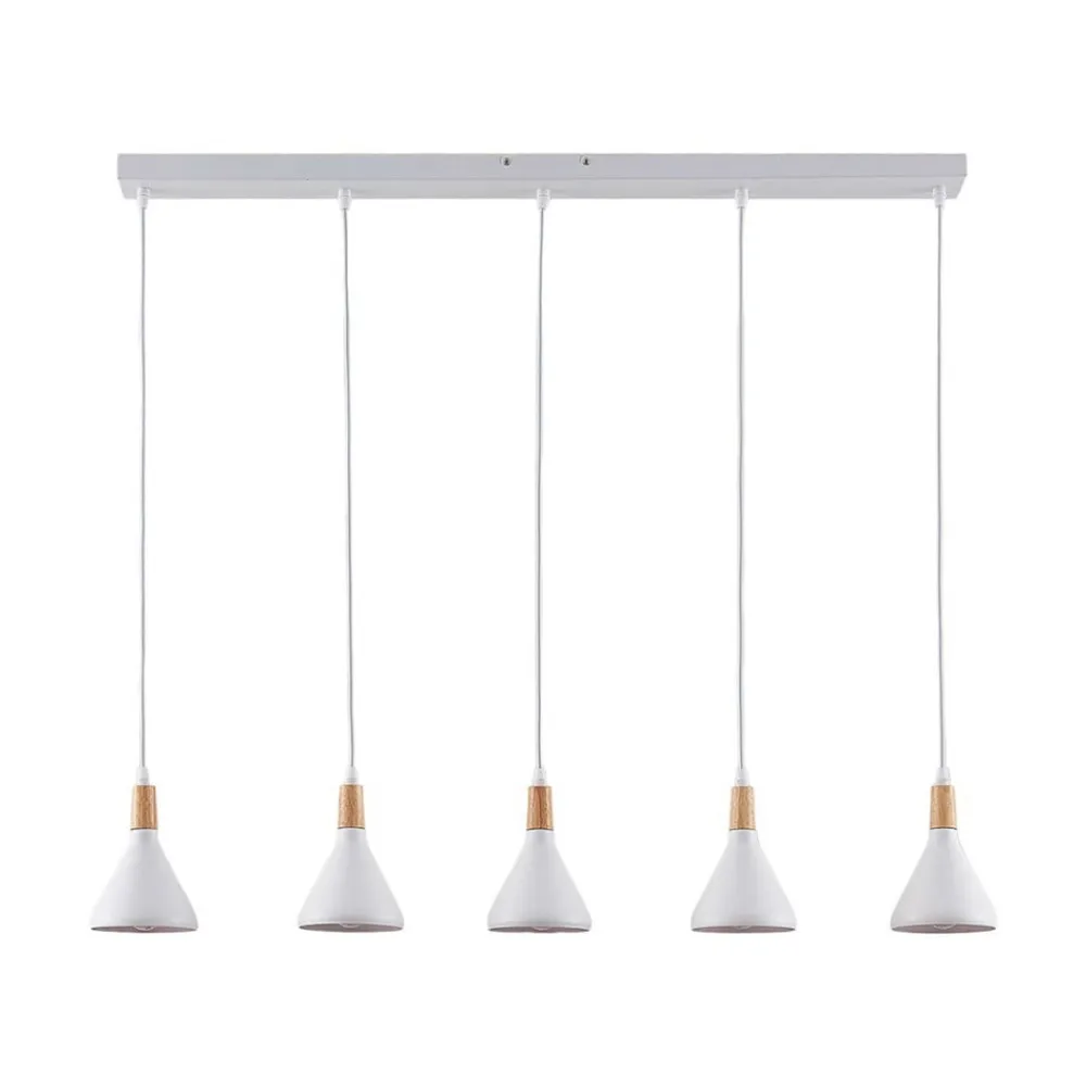 Æstetisk Arina-pendel med fem hvide metalskærme og trædetaljer Denne pendellampe er ideel til belysning af et spisebord, da de fem lampeskærme strækker sig over en længde på lidt over en meter og giver en jævn belysning af et stort område. Skærmene udvider sig jævnt mod bunden, og lyset skinner kun nedad på grund af metaloverfladen, så bordets overflade oplyses endnu mere specifikt. Det overordnede design har et skandinavisk præg, fordi det æstetisk kombinerer et puristisk udtryk med en hyggelig helhedsvirkning og også integrerer varmt udseende træelementer.