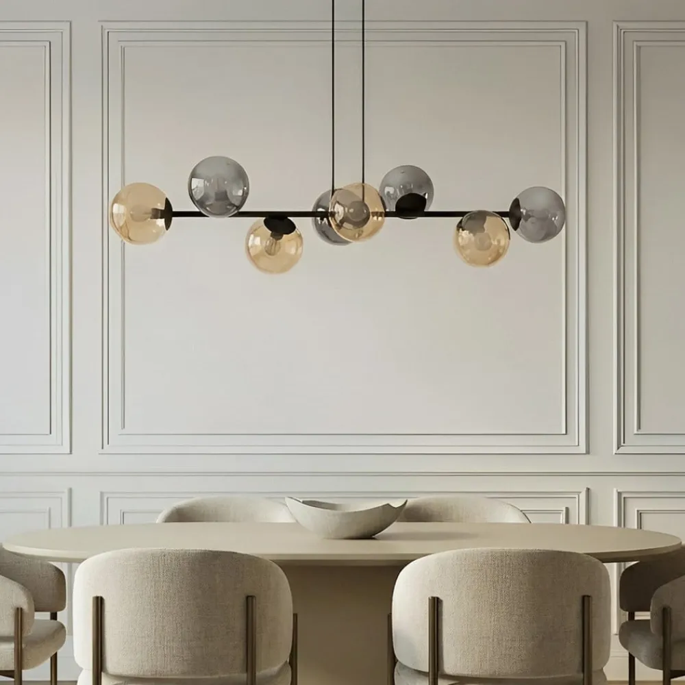 Isamer pendellampe med kugleformede skærme: Elegance i røgfarvet grå og rav Oplev elegancen i Isamer pendellampen, som med sit røgfarvede grå og ravfarvede design giver et moderne præg til opholds- og spisestuer. Denne pendellampe er ikke kun et stilfuldt tilbehør, men også en stemningsskaber, der skaber atmosfære med sit lys. Uanset om det er til en hyggelig sammenkomst eller en inspirerende middag – denne lampe tilpasser sig enhver situation. Bemærk, at der kræves en ekstern dæmper for at regulere lysstyrken efter ønske og skabe den perfekte atmosfære.