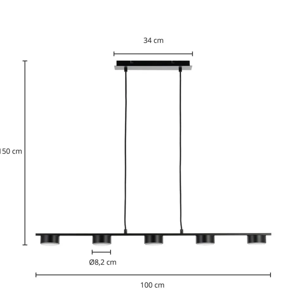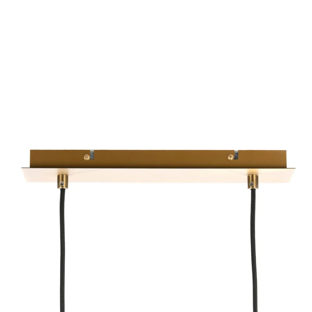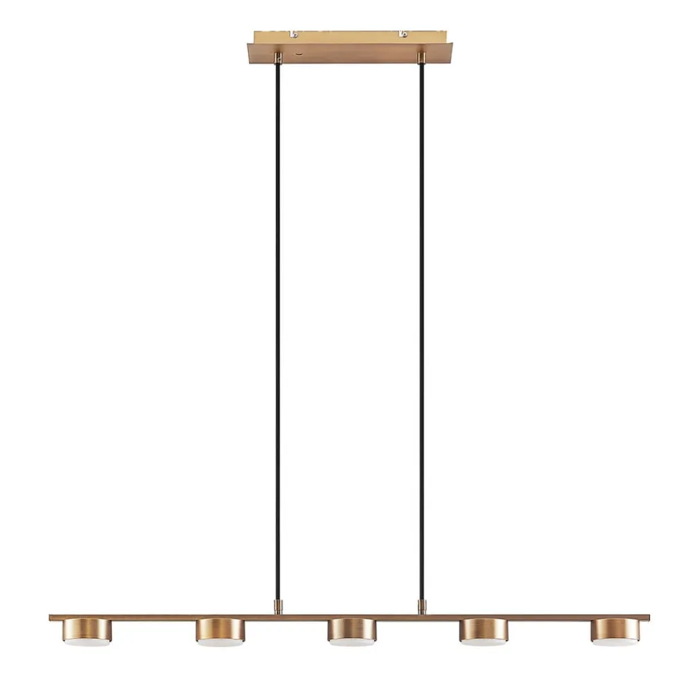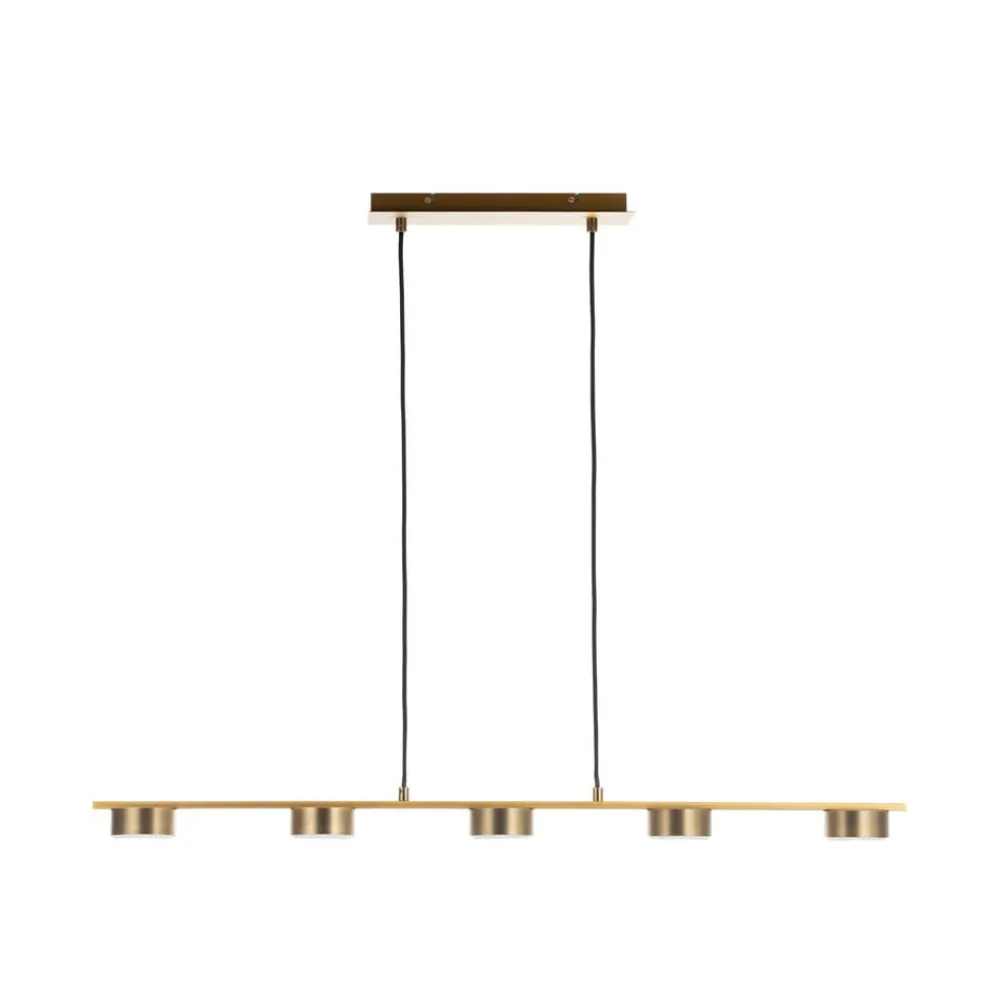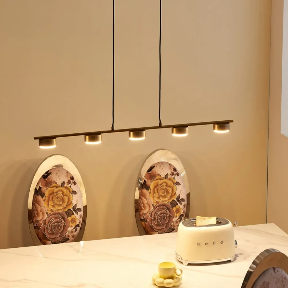 Bronzefarvet pendellampe i bjælkeform Kaylou med fem runde skærme Kaylou kan bruges som pendellampe i en spisestue, hvor dens aflange form kan belyse et spisebord godt og skabe et klart lys. Metallet er belagt med en smuk bronzefinish, som ikke bare ser elegant ud, men også kan integreres godt i klassiske boligstile, selv om den minimalistiske form fremstår grundlæggende moderne.