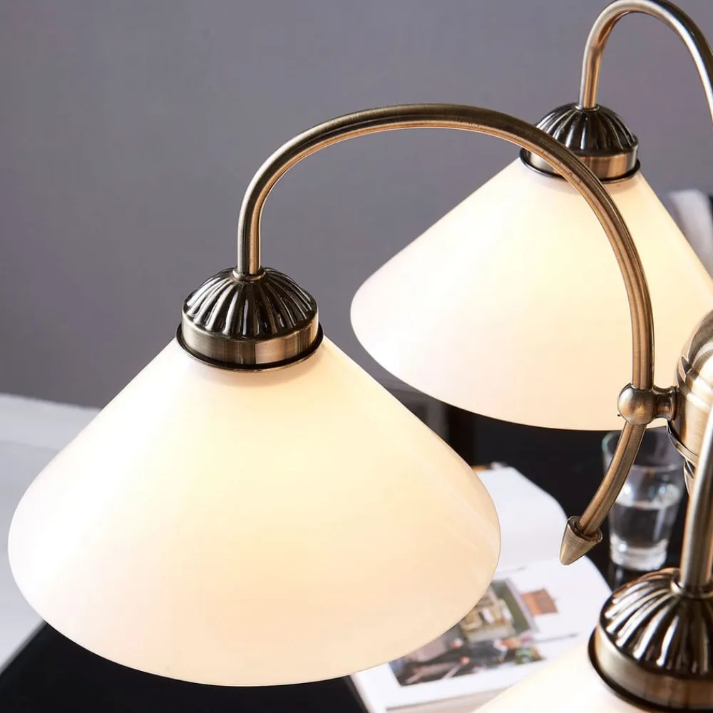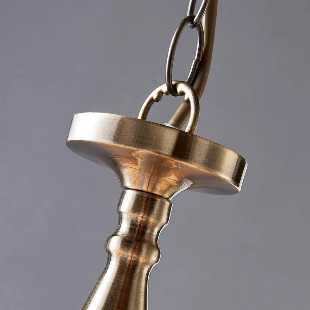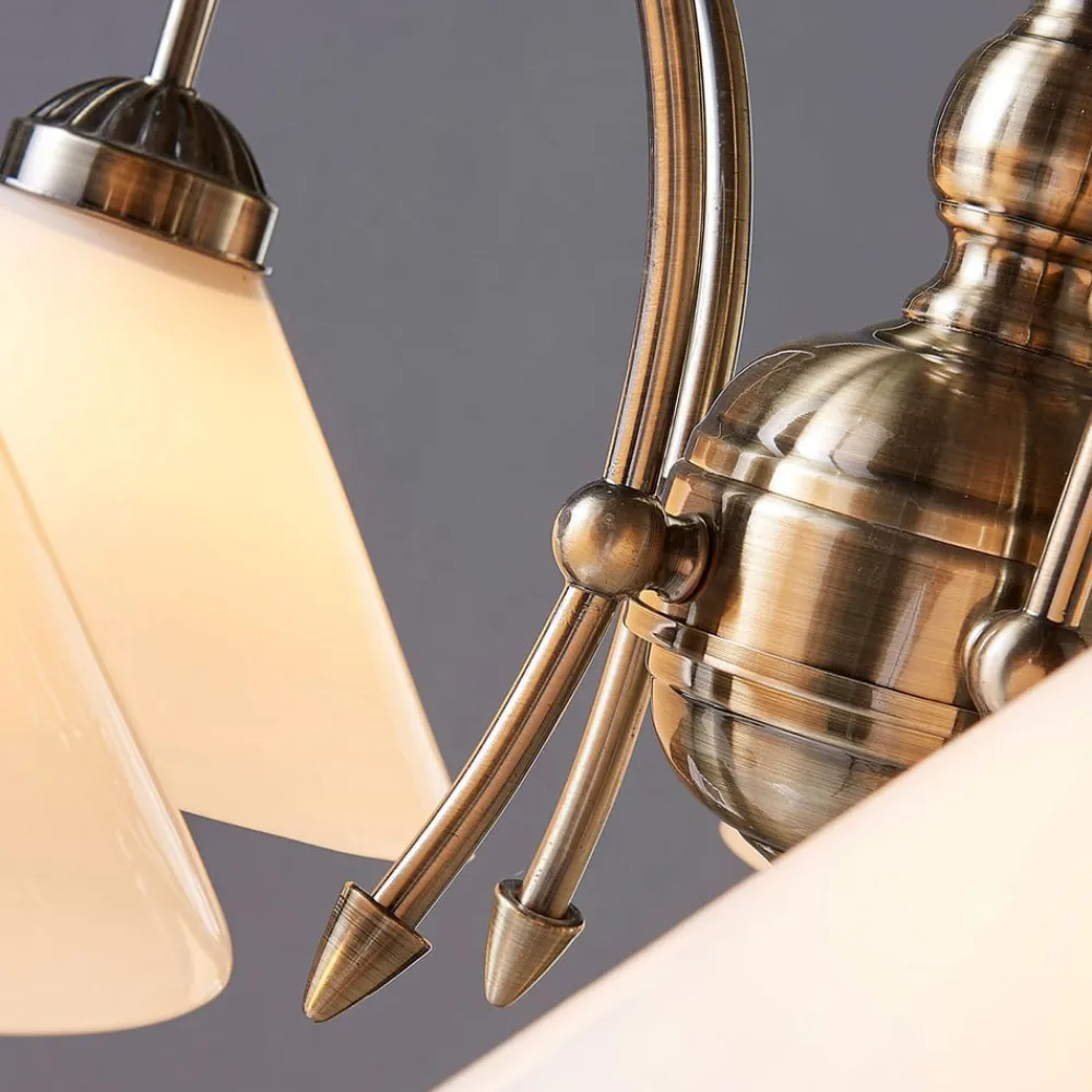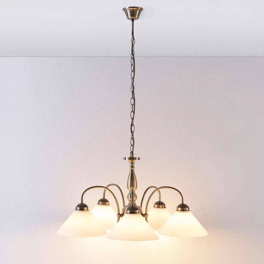 Attraktiv Otis-pendel med smukke metaldetaljer i antik messing Hver skærm på Otis-pendlen er næsten kegleformet og spidser til fra bund til top. Det anvendte materiale er blankt hvidt opalglas, som skaber et meget behageligt lys og derfor bader rummet i en hyggelig atmosfære. Rammen, som er lavet af detaljeret og delvist buet metal, bør dog ikke overses. Hele overfladen på metalkomponenterne er malet i antik messing, hvilket giver den et antikt udseende. Fordi der her er brugt i alt fem skærme, som er arrangeret i en rund cirkel, er hængelampen ideel til montering over en bordoverflade, som så får en god, lys belysning.