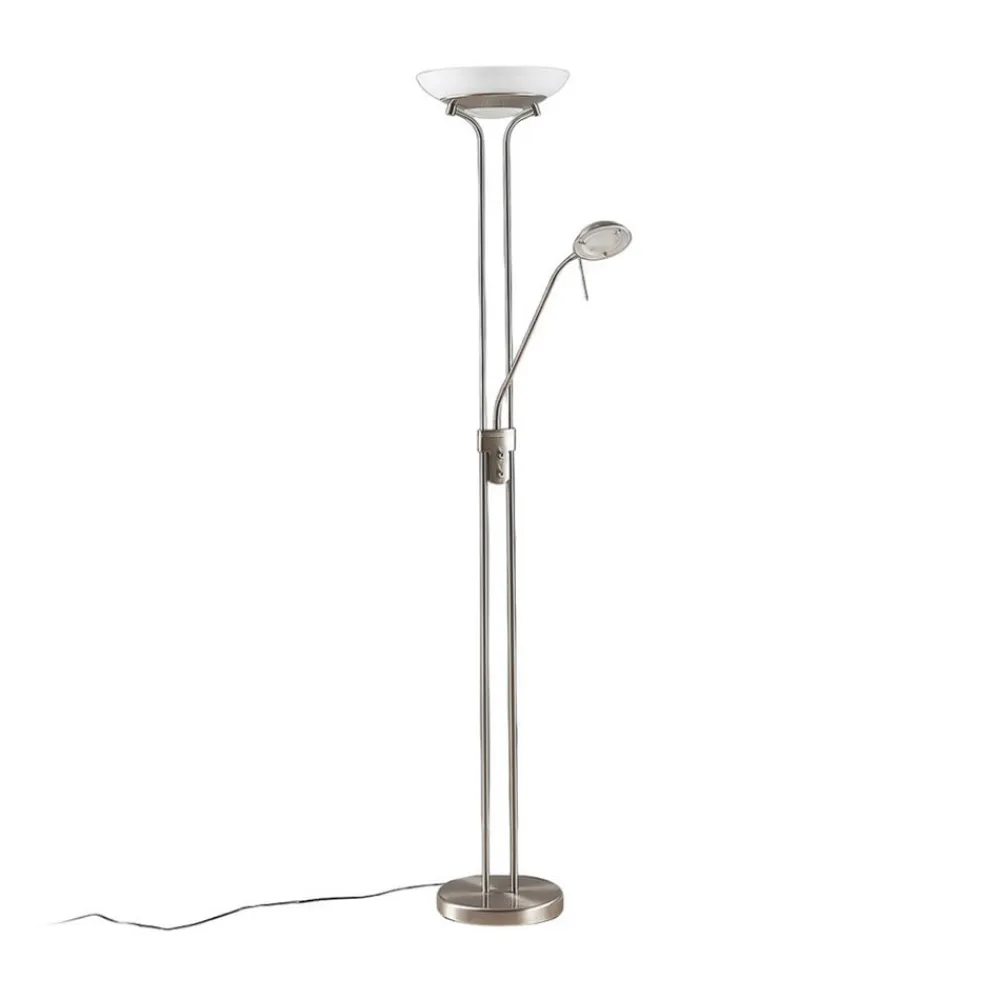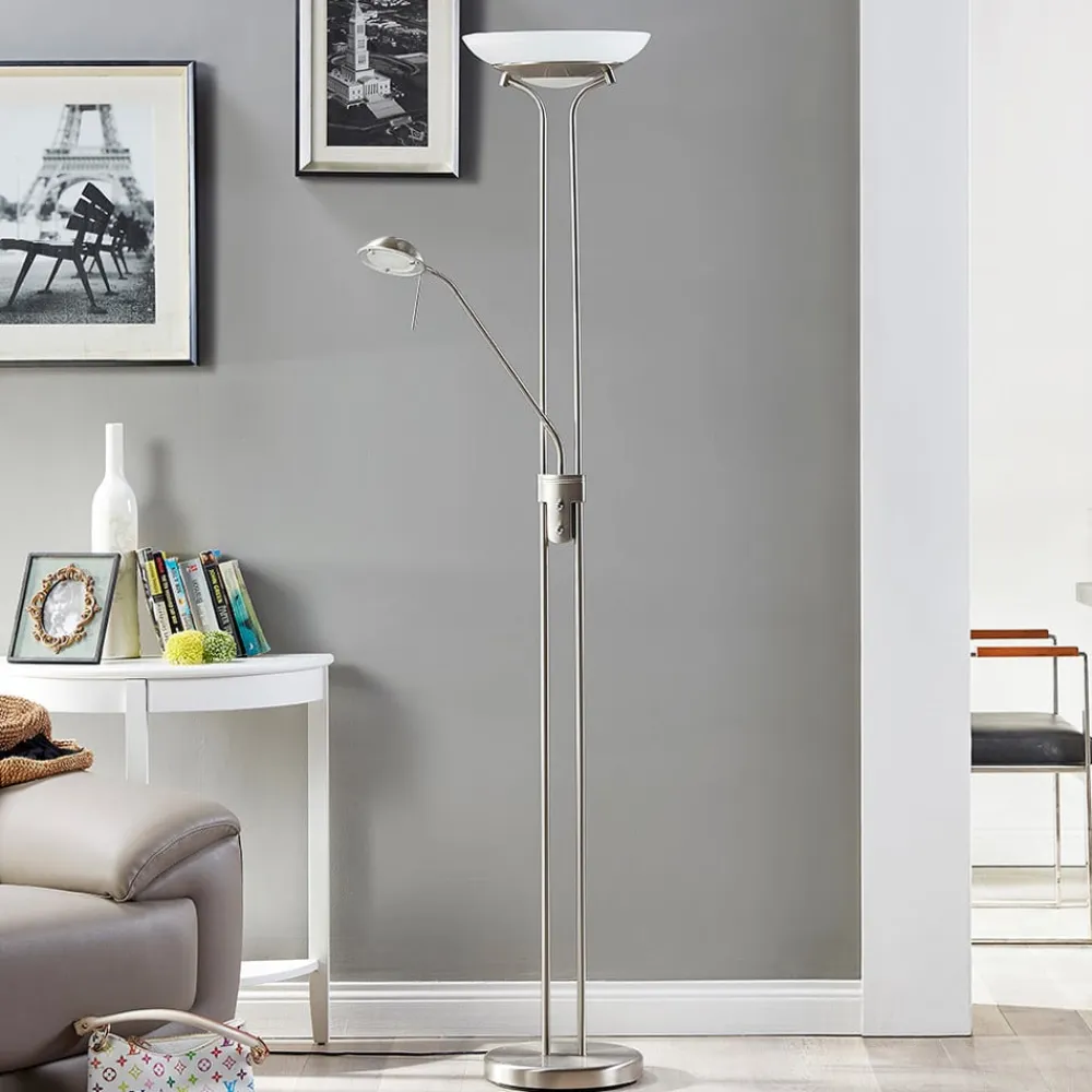 Attraktiv Yveta LED-uplight med ekstra læselampe og dæmper til begge lyskilder Yveta LED-uplight imponerer med et smukt look, der virker relativt tidløst. LED-uplighten er ideel som ekstra belysning i stuen, fordi den ikke kun består af én lyskilde, men to, der supplerer hinanden perfekt. For det første er der projektørskålen, som er lavet af hvidt satineret glas med alabastmønster, og for det andet har Yveta en integreret læselampe, der strækker sig ud fra rammen på LED-læselampen i form af en ekstra arm. Denne arm er placeret ca. midt på rammen og er ikke fast, men kan flyttes efter behov, da der er monteret et lille, trinløst fleksibelt led både under det lille lampehoved og direkte på rammen. Navnet læselampe indikerer allerede, at denne lyskilde er ideel til læsning eller til generelle aktiviteter, der kræver et centreret, målrettet lys, der aflaster øjnene så meget som muligt. Selve uplighten giver derimod et blødt, meget mere diffust lys, som kun kommer indirekte ind i rummet og derfor skaber en særlig hygge og en meget hjemlig karakter. For at perfektionere lysbilledet og tilpasse det optimalt til dine egne behov er Yveta blevet udstyret med to dæmpere, som er placeret i midten af rammens højde og derfor er nemme at nå. For at ændre lysstyrken på den ene eller den anden lyskilde skal man blot dreje på de diskrete knapper for at gøre den lysere eller mørkere. Det faktum, at både uplighteren og LED-læselampen er oplyst af LED’er, betyder, at der kan opnås god energieffektivitet, hvilket lover stærkt lys og lavt strømforbrug.