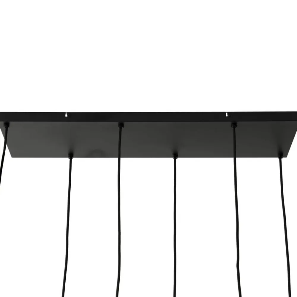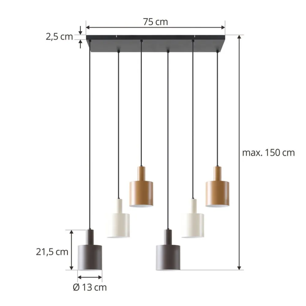 Ovelia hængelampe med 6 lyskilder og forskellige farvede skærme Ovelia hængelampen er ideel til at oplyse et langt spise- eller stuebord. Den er lavet af jern og består af en sort baldakin og seks skærme. Disse hænger forskudt for hinanden, er i mørkebrun, kaffebrun og beige og giver pendellampen et særligt look, selv når den er slukket. Lyset reflekteres af den hvide inderside af skærmene og spotlights mod gulvet.