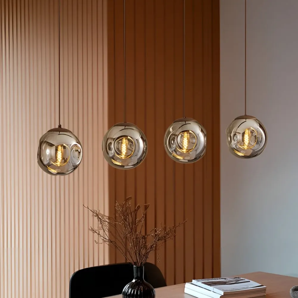 Valentina-pendel med fire lys og glasskærme Den moderne Valentina-pendel kan bruges fleksibelt i opholdsrummet. Takket være det diskrete, men moderne farvedesign passer den ubesværet ind i f.eks. køkkenet, spisestuen eller stuen. Lyset udsendes hele vejen rundt gennem glasskærmene og skaber en hyggelig atmosfære i rummet. Skærmene har en rund form, der er kendetegnet ved dekorative indhak på siderne. Det giver pendlen et særligt udtryk. Valentina er ideel til at belyse et langt opholds- eller spisebord. Dekorative lyskilder er særligt velegnede som lyskilder.