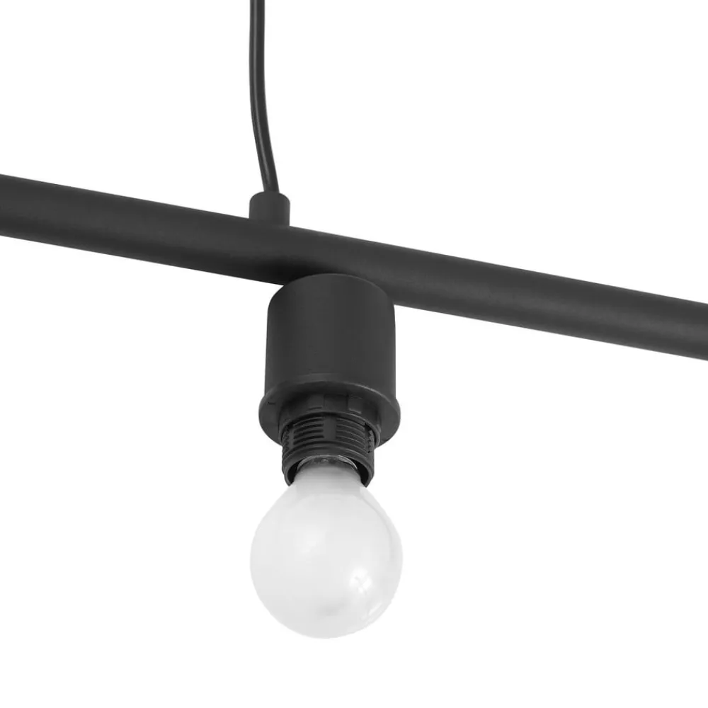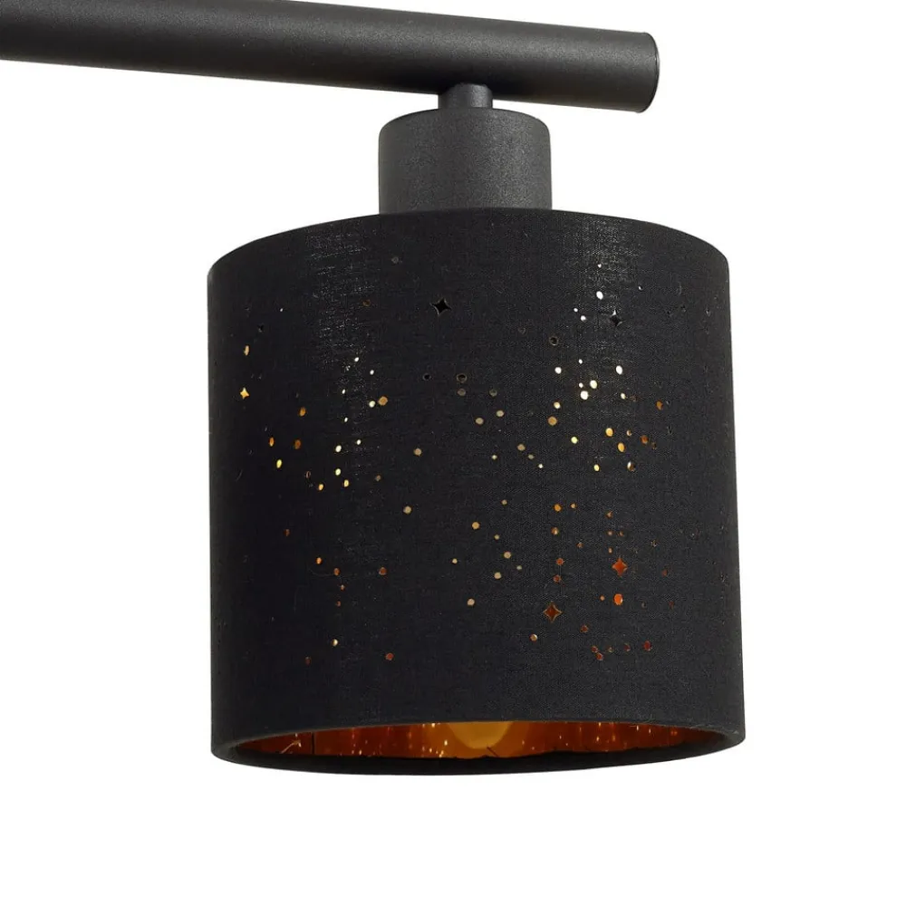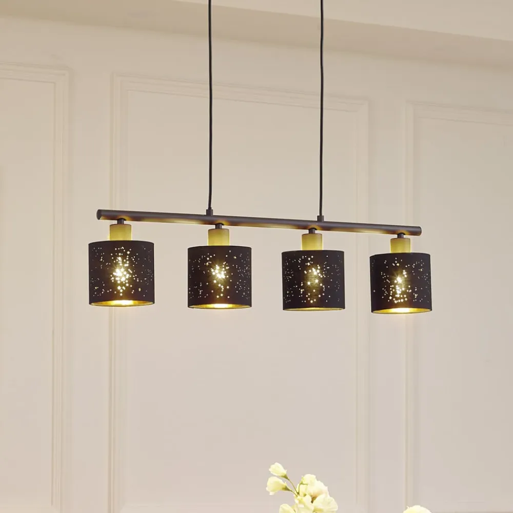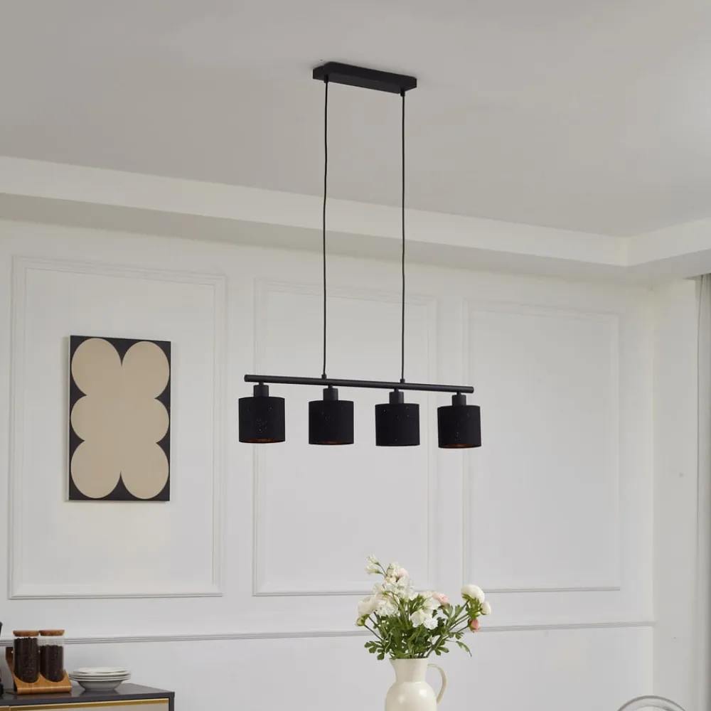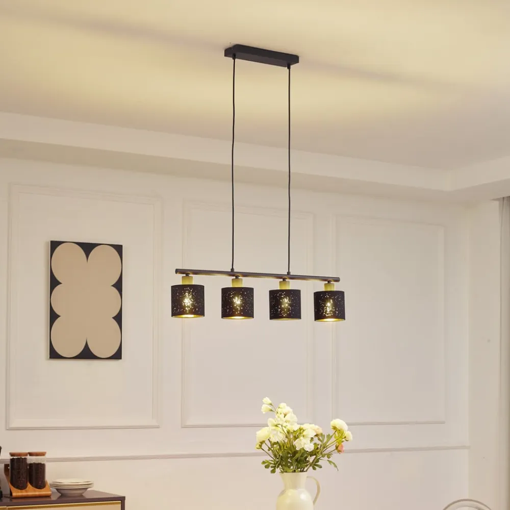 Sort og guld stofpendellampe Vasilia Lethed og udstråling går hånd i hånd med Vasilia pendellampen i høj kvalitet, som oplyser spisebordet særligt smukt med sine fire lampeskærme arrangeret på række, men også gør en fin figur over opholdsstuen. Lampen hænger fra loftet i to tynde kabler, som sammen med den gyldne farve indeni skaber et sofistikeret og alligevel delikat indtryk, der afrunder stemningen derhjemme på en imponerende måde. Det enkle ydre i sort farve bidrager væsentligt til pendellampens stilfulde design.