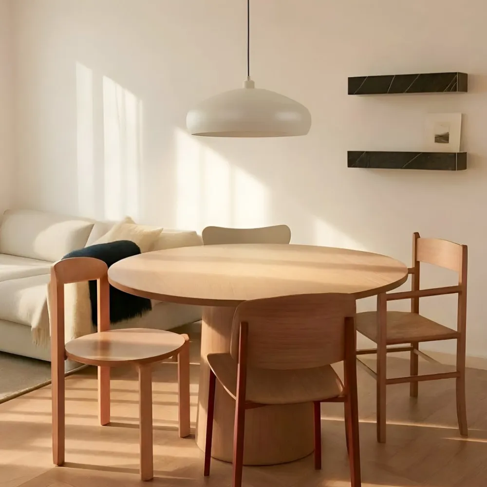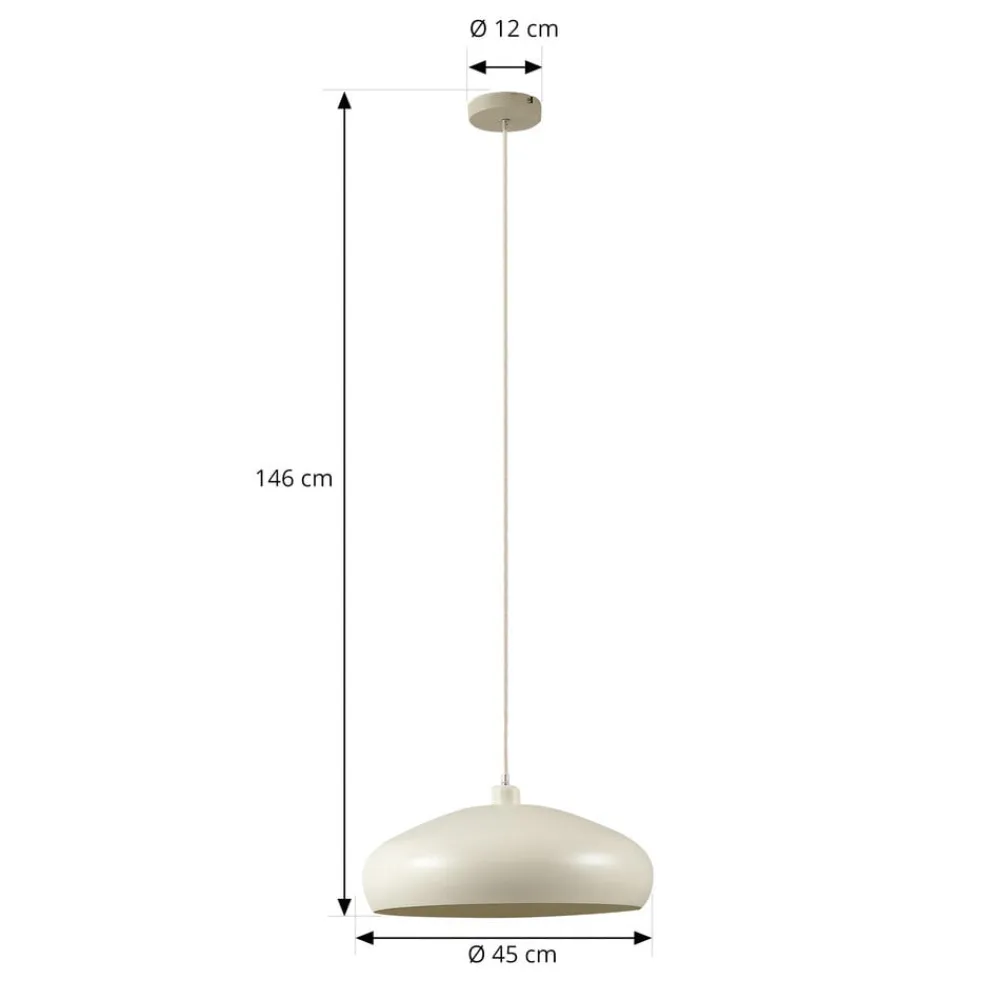 Elover rund hængelampe af jern Den 1 lyskilde Elover hængelampe er lavet af jern. Den runde skærm er uigennemsigtig hele vejen rundt og er kun åben i bunden. Det gør, at det genererede lys kan strømme direkte nedad og f.eks. belyse bordoverflader i stor udstrækning. Indersiden af skærmen reflekterer forsigtigt lyset ud i omgivelserne og understreger Elovers smukke beige farve.