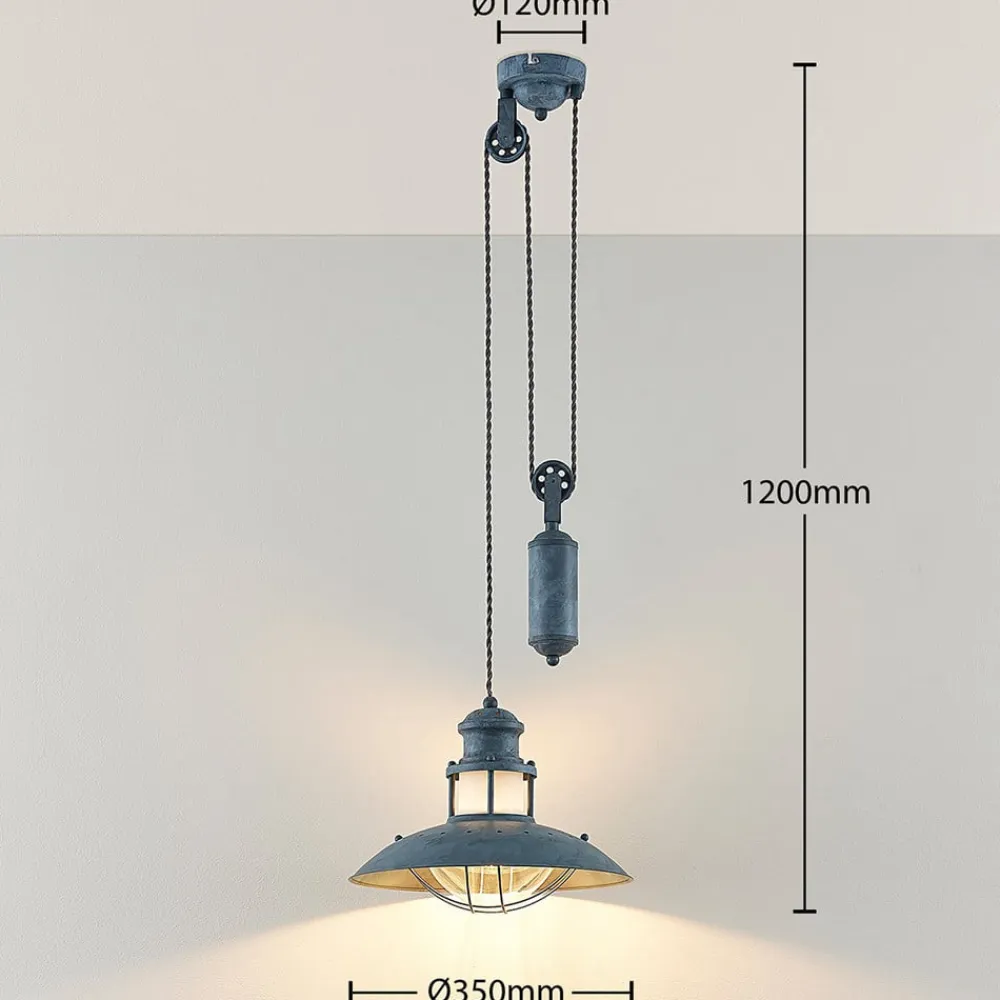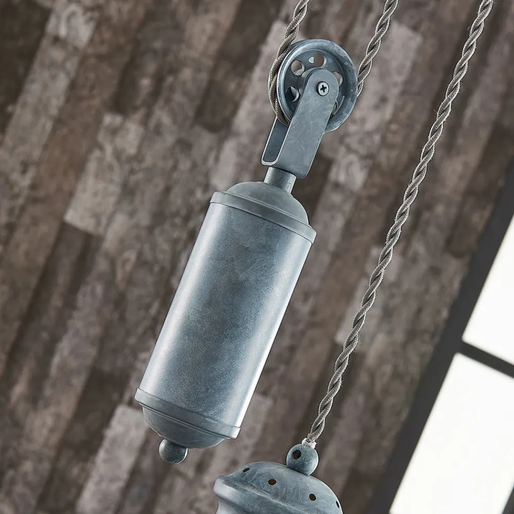 Højdejusterbar Louisanne hængelampe med et rustikt, industrielt look Skærmen på Louisanne hængelampen er hovedsageligt lavet af metal, men har også et glaselement, der matcher det overordnede look. Metaloverfladen har her en betongrå finish, som ikke fjerner Louisannes rustikke effekt, men giver den et ekstra industrielt præg. Særlig bemærkelsesværdig er yoyo-pendlen, som gør det muligt at justere højden optimalt med få enkle trin. Højden kan justeres fra 110 cm til 235 cm, hvilket er særligt populært over et bord i køkkenet. Afhængigt af lysindfaldet kan armaturets grå farve variere fra grøn til blålig.