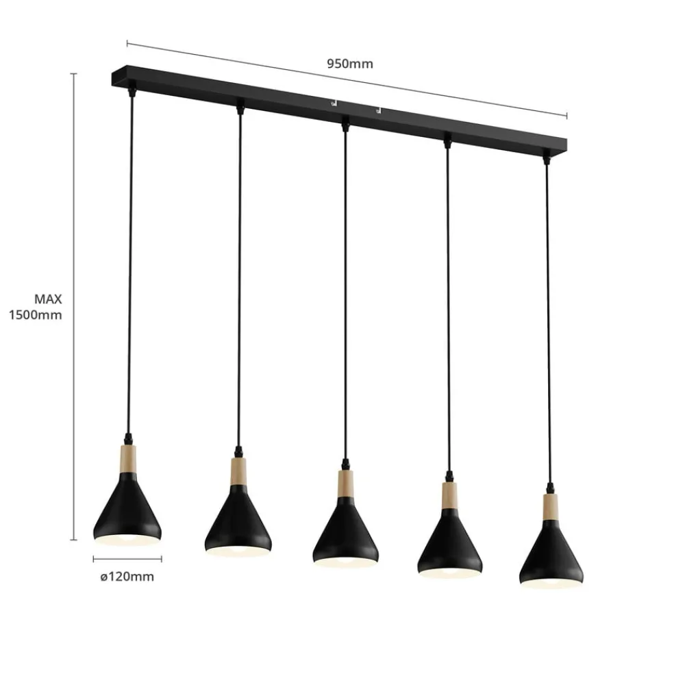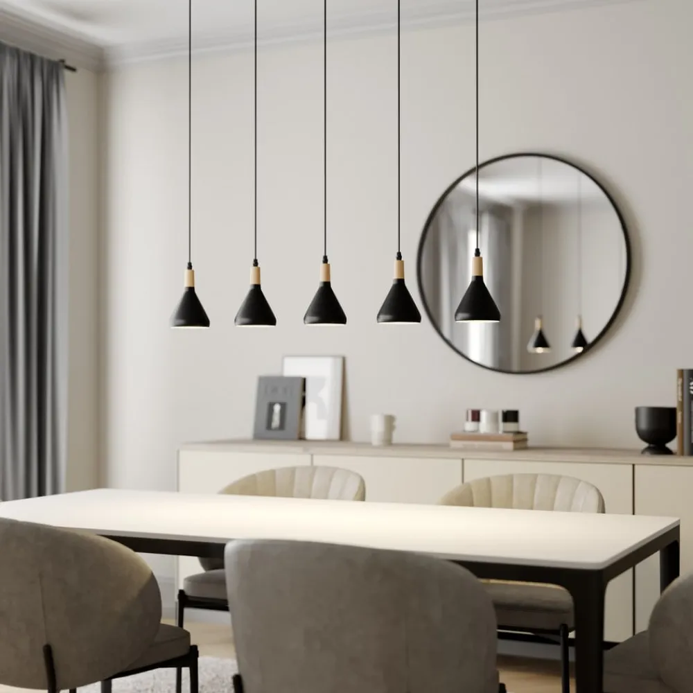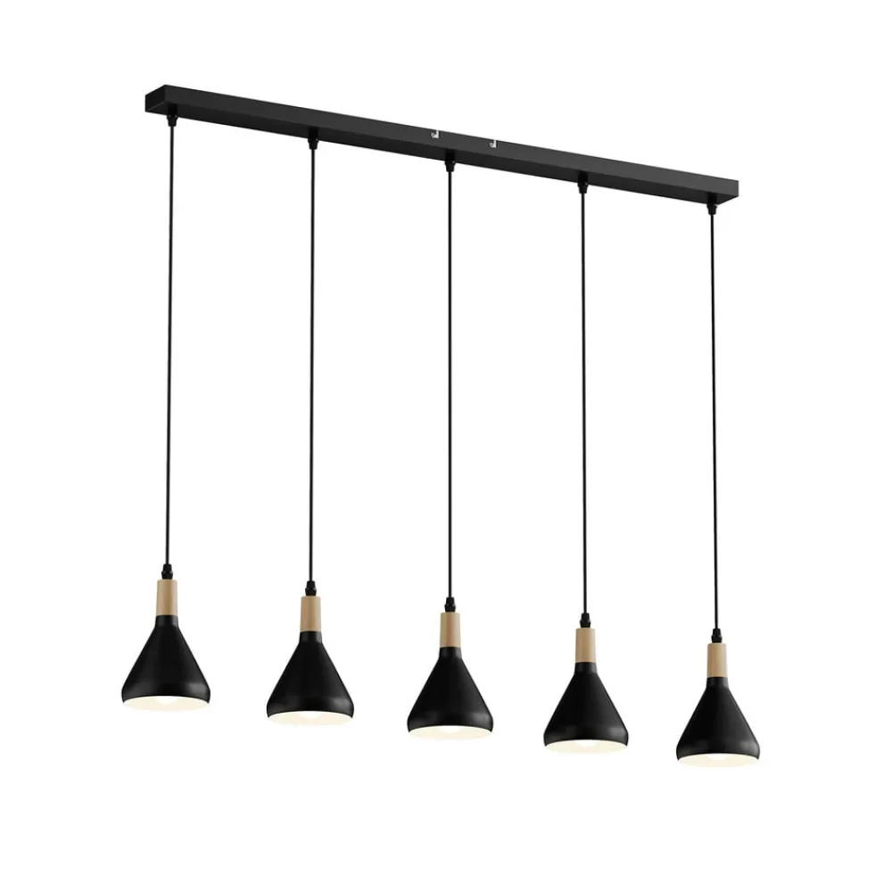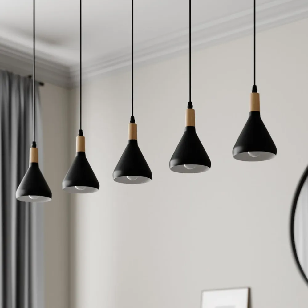 5 lyskilder Arina hængelampe med koniske metalskærme i sort Arina hængelampen er en meget velegnet lyskilde til spiseområdet, som er præget af stilfuld elegance og også kan kombineres med skandinaviske boligstile. Skærmene slutter med en trædetalje i toppen, som udstråler en naturlig effekt og står i smuk kontrast til den sorte metaloverflades kølighed.