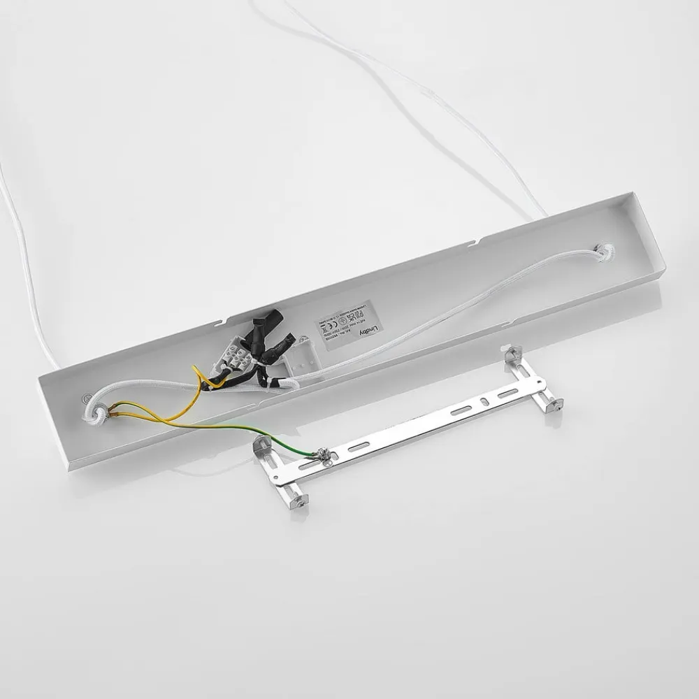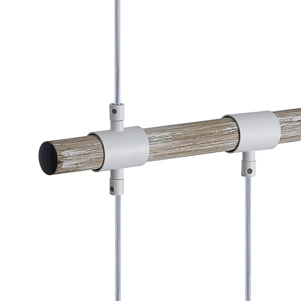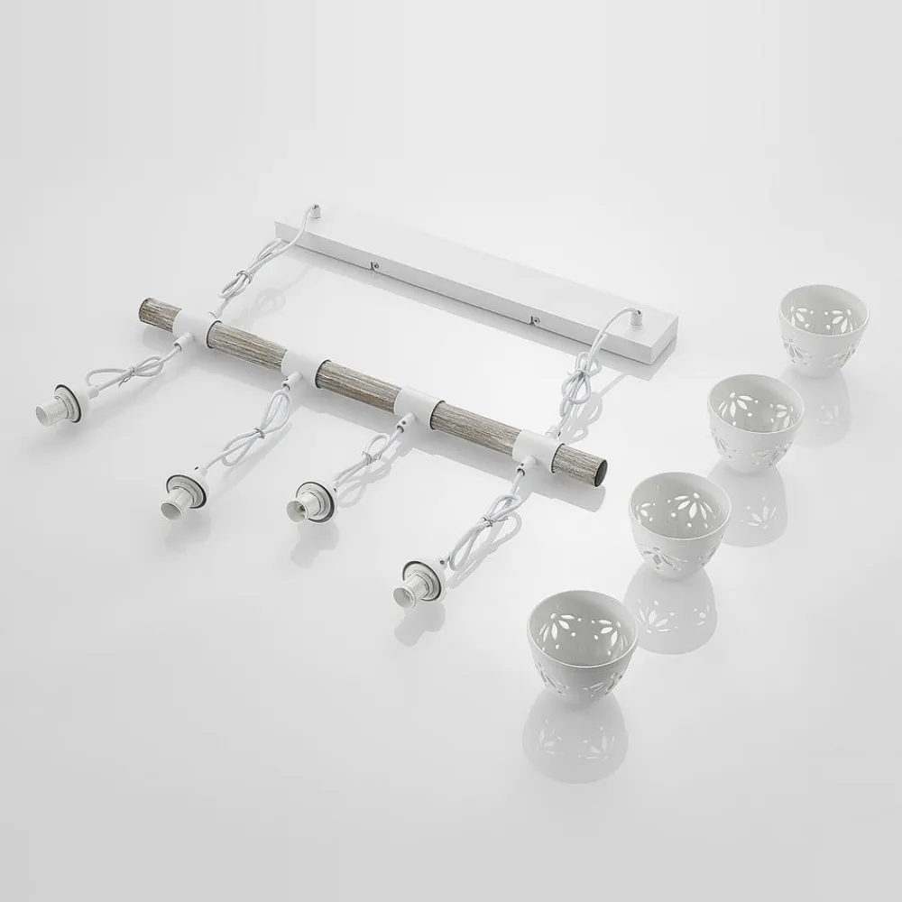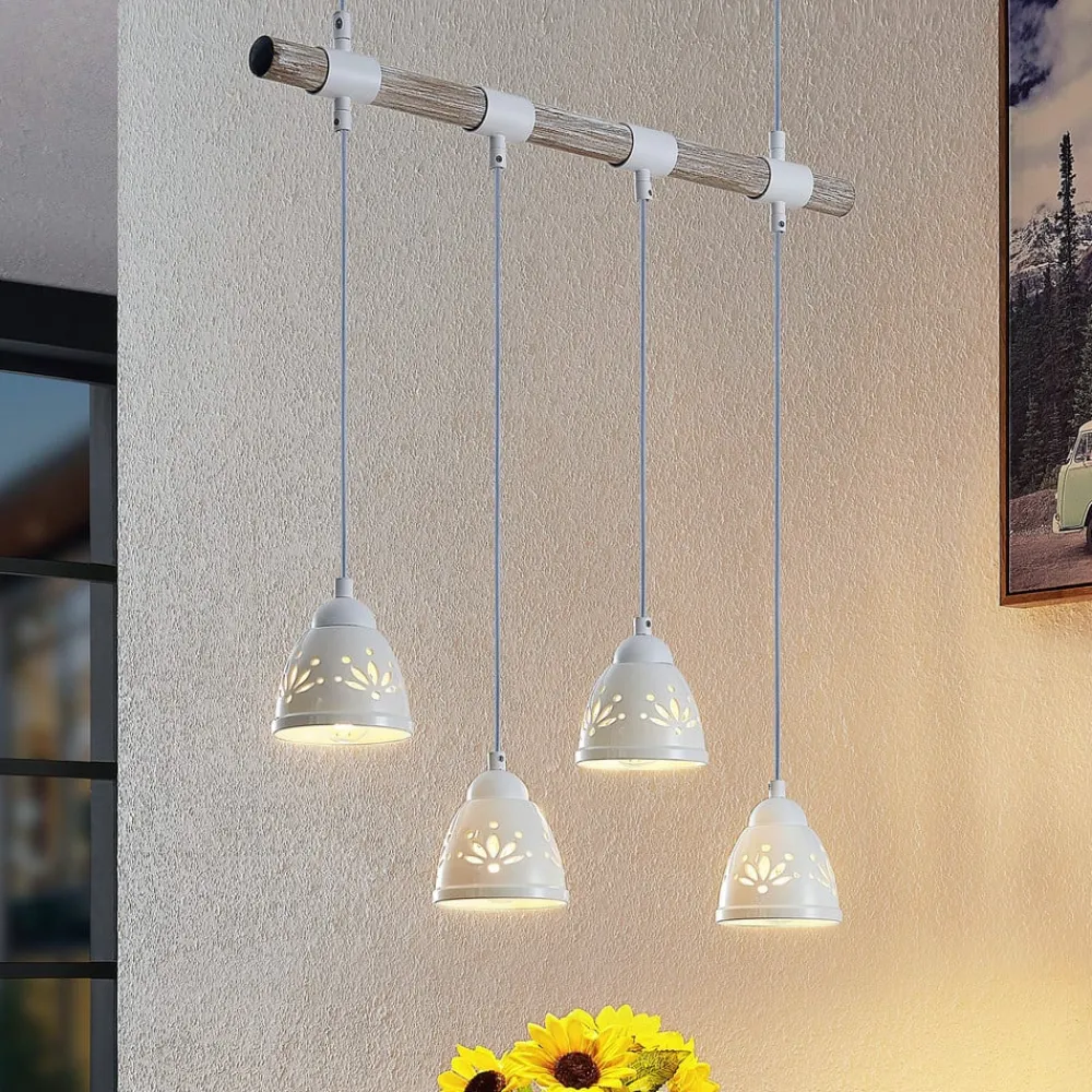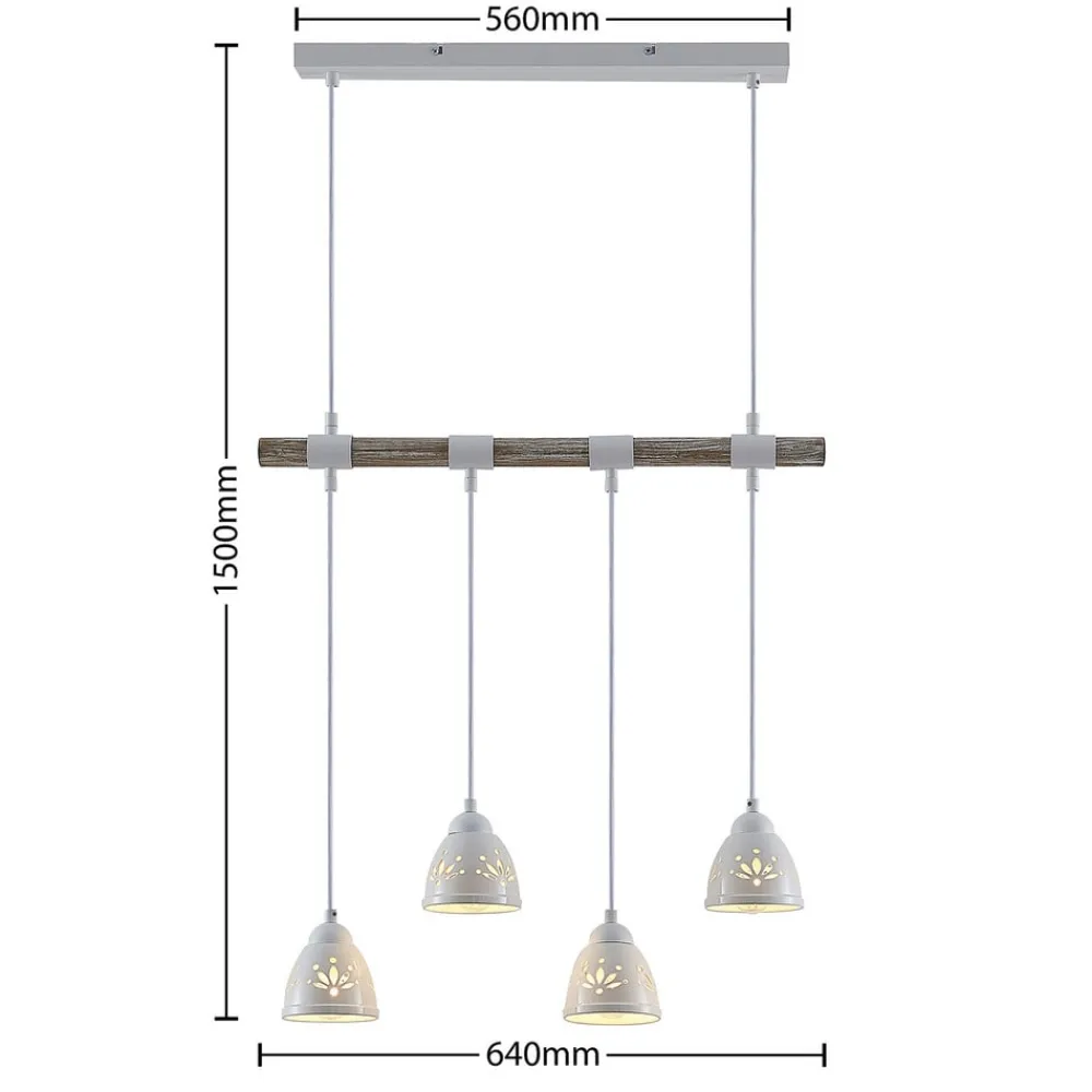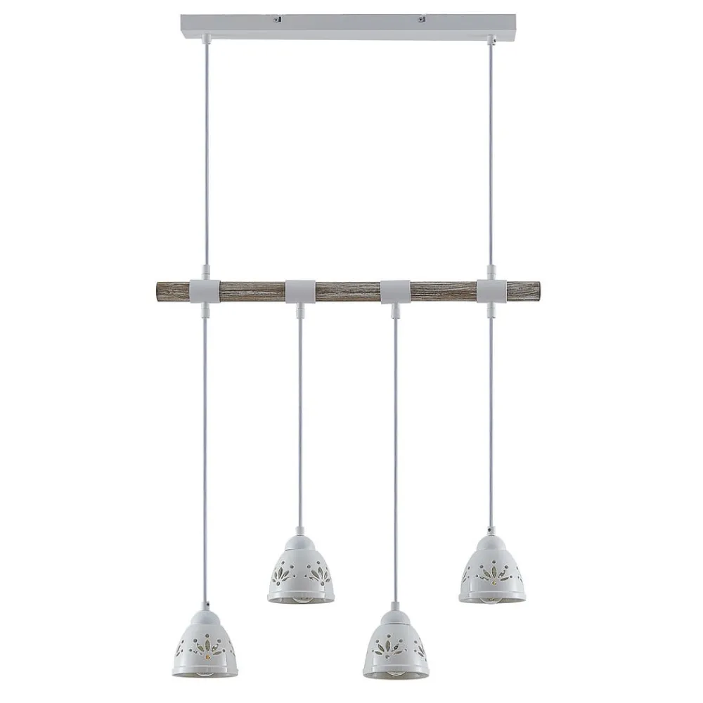 Denne interessante vedhængslampe har en enkel, men fascinerende stil. Dens loftsophæng samt den horisontalt justerede bjælke er fremstillet af stål, mens bjælken er beklædt med en smuk trædekoration. Der er fire nedadgående lampeskærme af keramik fastgjort til den. Overfladebehandlingen i hvid ser diskret og elegant ud. Denne lampe er meget flot over et større spisebord og bringer hygge ind i stuen.