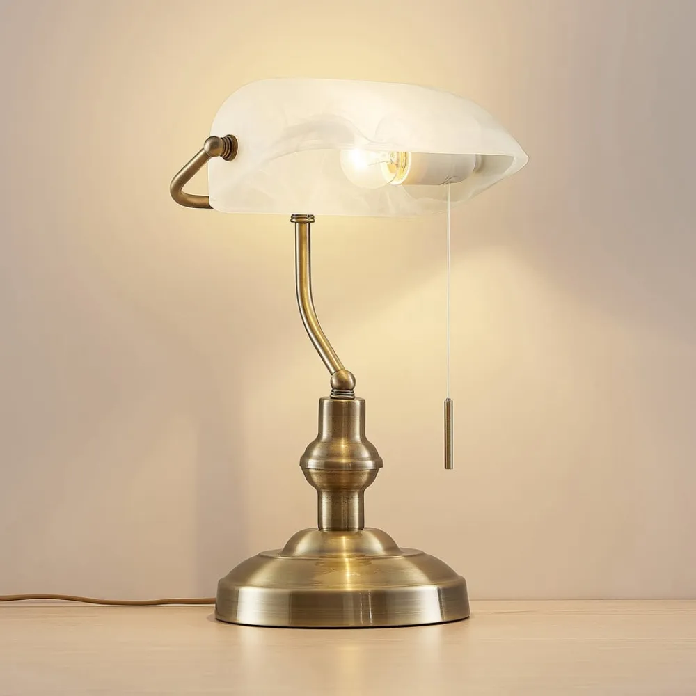Profina skrivebordslampe designet i bankmandsstil – optimal lyskilde til arbejdspladsenProfina skrivebordslampen er designet som en klassisk bankmandslampe, der har en nostalgisk og samtidig stilfuld effekt med sit specielle look. Bankmandslampen har sin oprindelse i begyndelsen af forrige århundrede, hvor den hovedsageligt fandtes i banker, biblioteker og advokatkontorer. Takket være den buede lampeskærm af opalhvidt glas sendes lyset hovedsageligt nedad, så arbejdsfladen ved bordet er godt oplyst, og omgivelserne forbliver blændfri. En praktisk trækkontakt er placeret på armaturet, så betjeningen forbliver enkel og bekvem for brugeren.