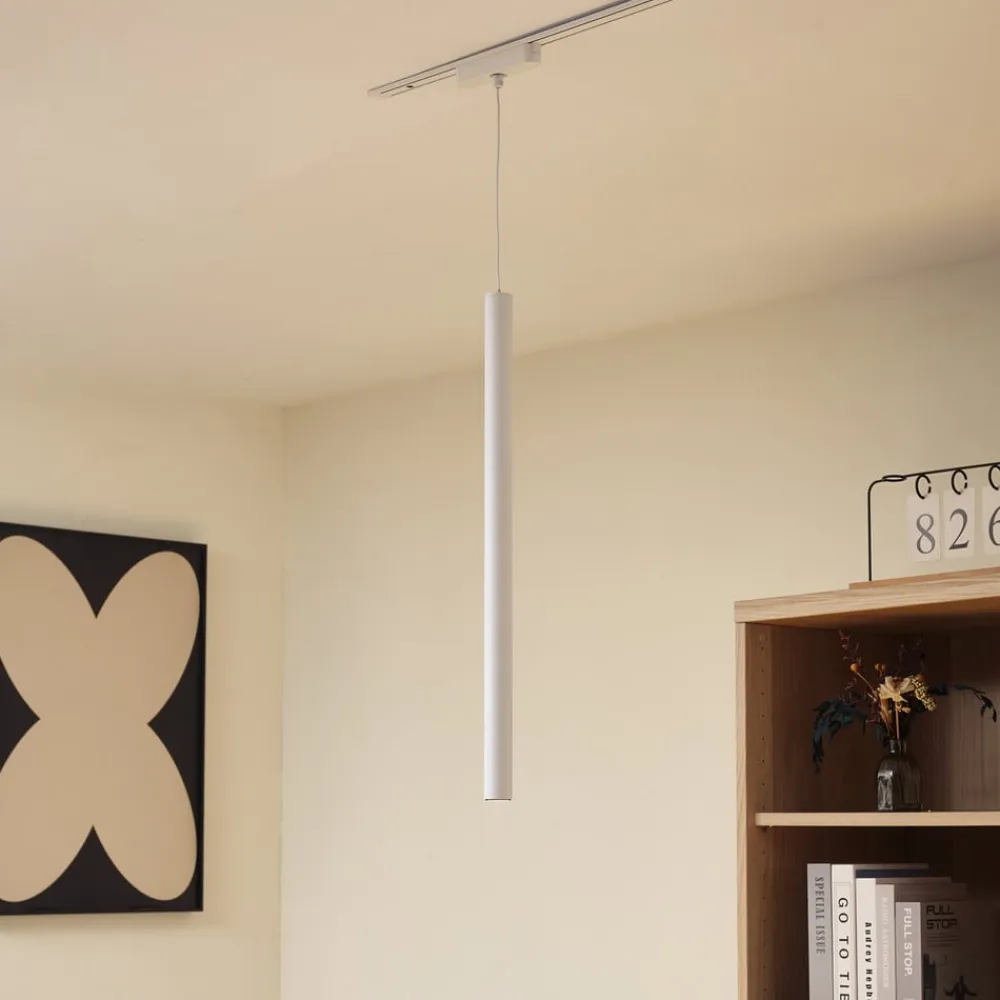 Lindby Skinnesystem>LED-pendellampe Lumaro, hvid, Ø 3cm,aluminium,48V,dæmpbar