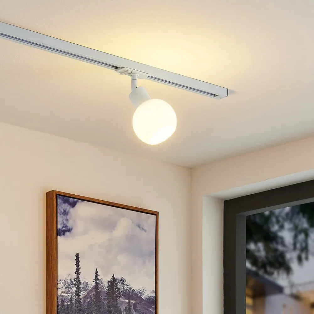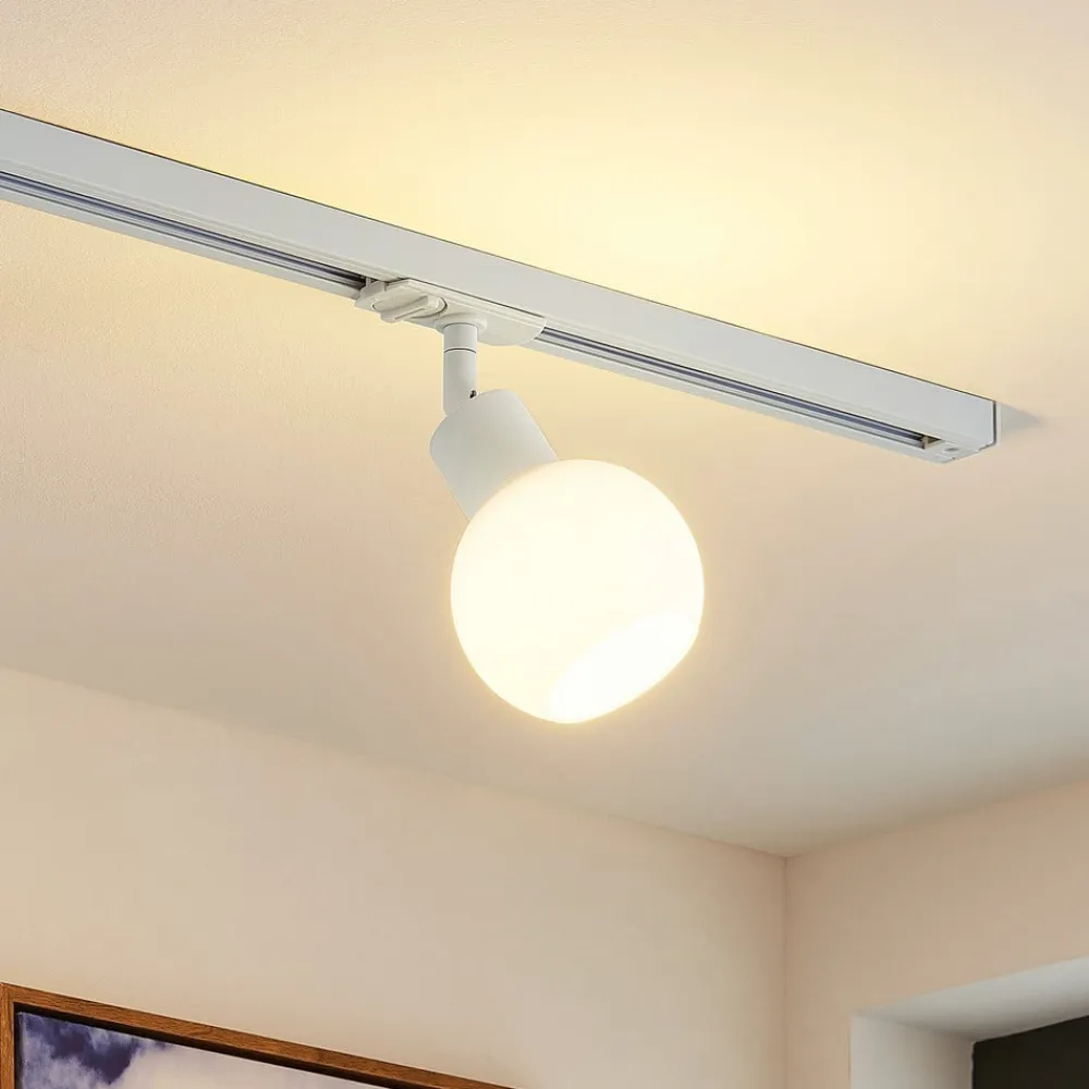 Med glasskærm – Linaro skinnespot, 1-kredsløbssystem, hvid Den lille Linaro skinnespot passer til et hvidt 1-kredsløbs skinnesystem og giver en lys, punktvis belysning. Lampeskærmen her er en attraktiv glasskærm, der giver et godt, behageligt lys – ideelt til moderne belysning og forskellige indretningsstile.