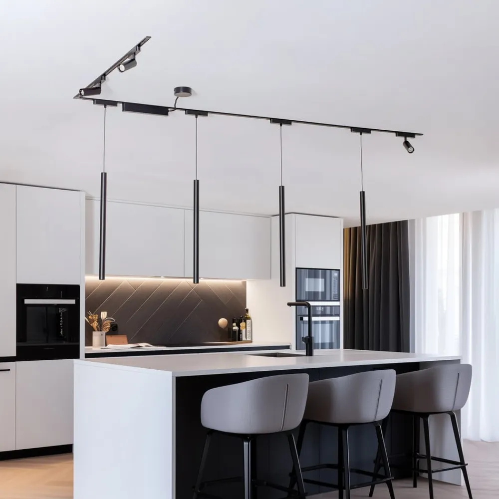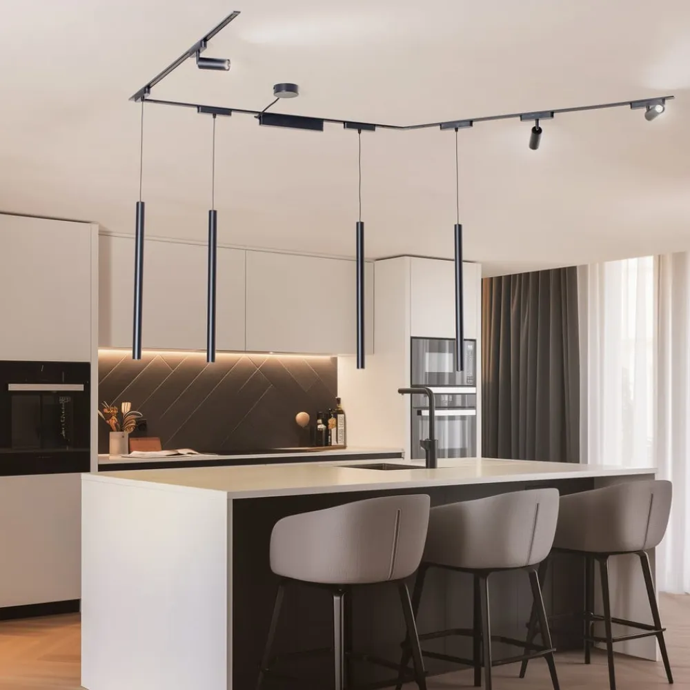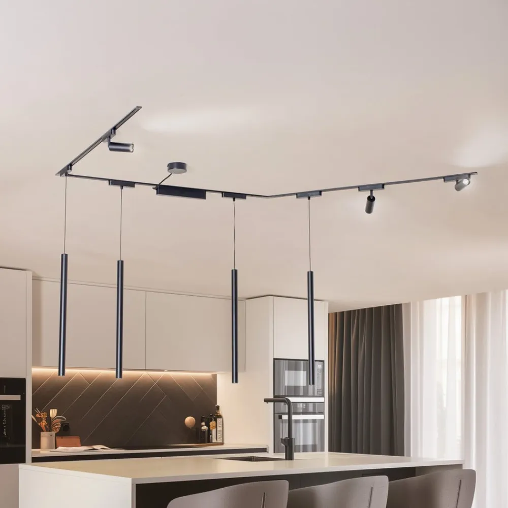 - inkl. 3 x strømskinne + 1 x LED-driver + 1 x fjernbetjening + 4 x LED-pendel + 3 x LED-spot + 1 x stik (135°) + 1 x L-stik (90°) + 1 x stik (180°)