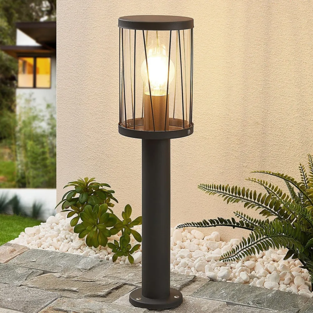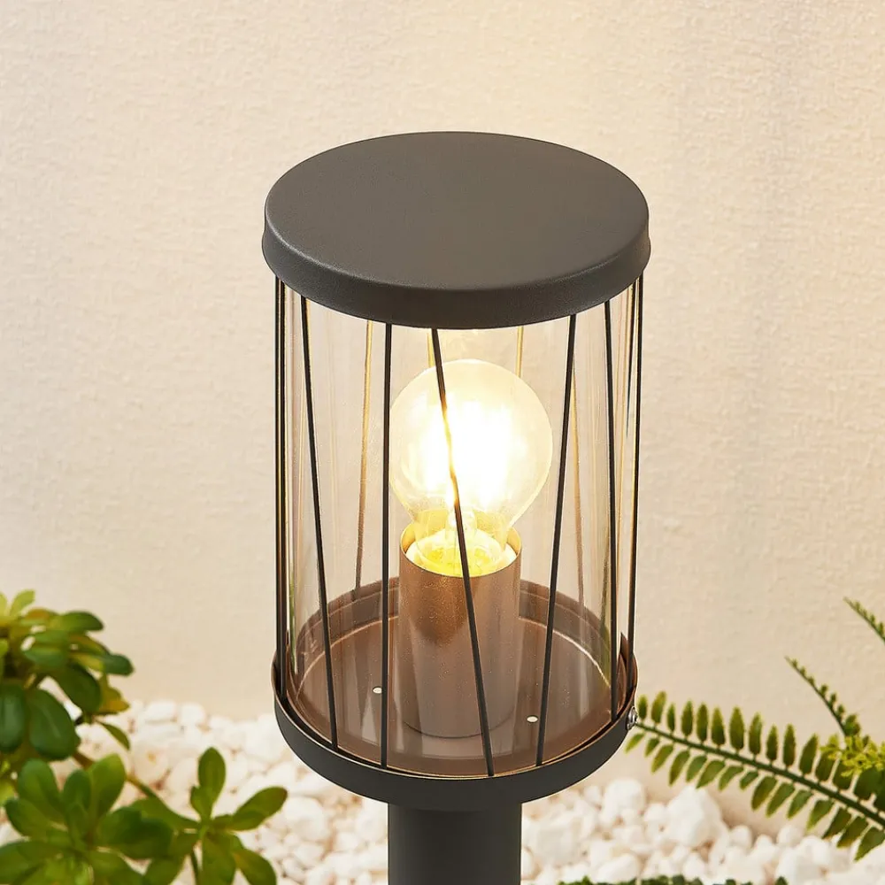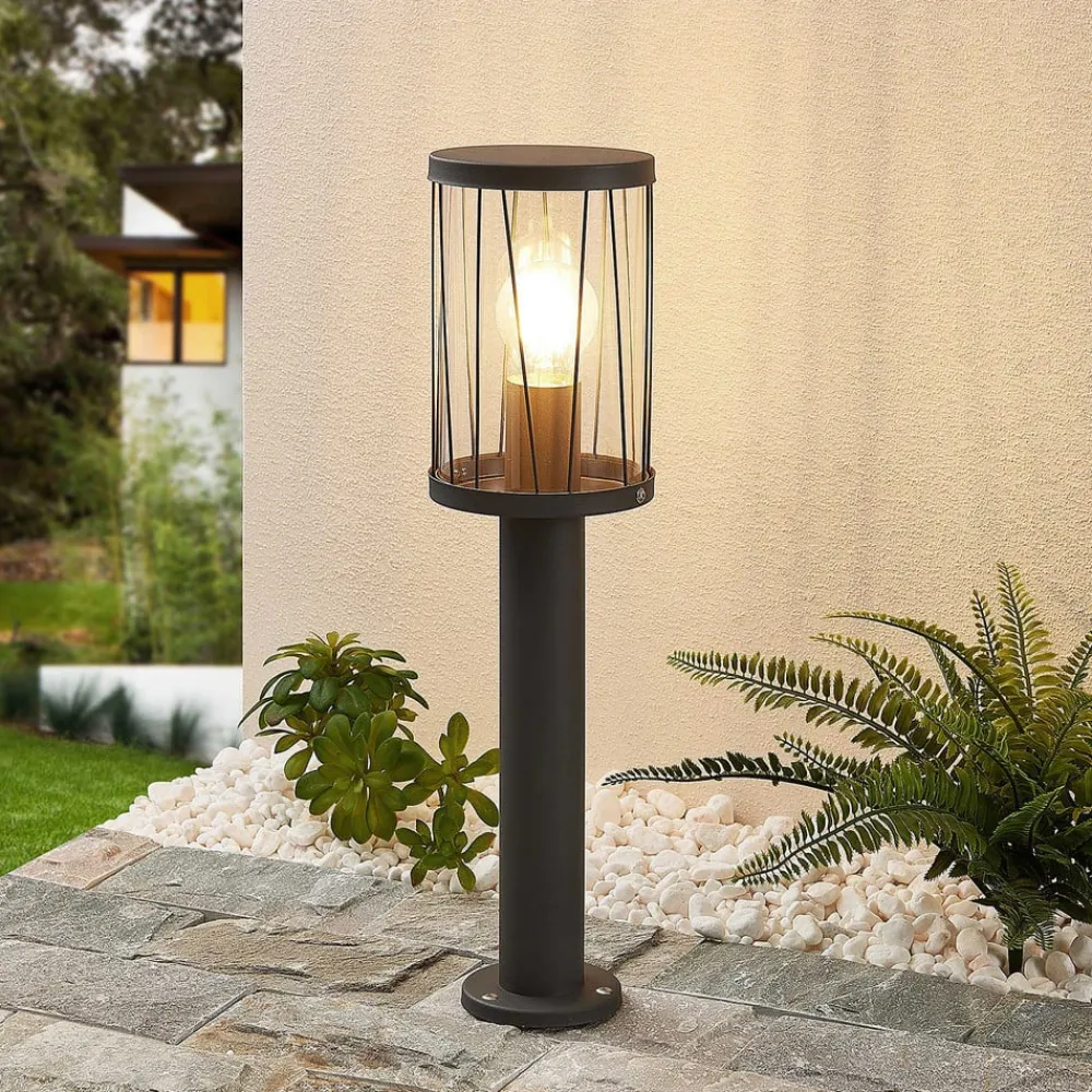 Rund Yonan sokkellampe som en stilfuld tilføjelse til moderne boligmiljøer Yonan er særligt velegnet til moderne design omkring huset og gården. Sokkellampen har en rund grundform og er en lyskilde med et mørkegråt hus i rustfrit stål, hvis skærm suppleres af en klar polykarbonatindsats. Man kan også genkende de smalle, skråtstillede stænger rundt om skærmen, som tilføjer et særligt stilfuldt og elegant dekorativt touch. E27-lampen forbliver dog altid tydeligt synlig og er en genkendelig del af det samlede look, og derfor passer glødelamper eller rustikke lyspærer særligt godt til udendørslampens design.