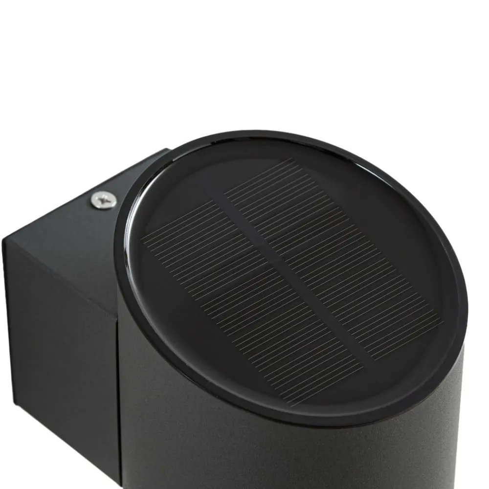 Antracitfarvet solcellevæglampe Bentlas i rustfrit stål, LED-drevet Denne LED-væglampe gør det muligt at skabe lys i forskellige udendørs miljøer, selv om der f.eks. ikke er nogen strømkilde eller tilslutning til elnettet. Det er muligt, fordi lampen har et integreret solpanel på toppen, som først omdanner sollyset til elektricitet og derefter til lys. Det betyder, at Bentlas også kan bruges på en smuk havegrund og f.eks. fastgøres til en lille hytte for at give lys, når der er brug for det, og det allerede er mørkt. Den antracitfarvede overflade og den cylindriske form har et behageligt tidløst look, og solcellelampen Bentlas er designet til at fungere i to lystilstande, så lyset kan skinne med fuld eller reduceret intensitet. Afhængigt af hvad du vælger, varierer den maksimale lysvarighed mellem 20 og 35 timer, når batteriet er fuldt opladet.