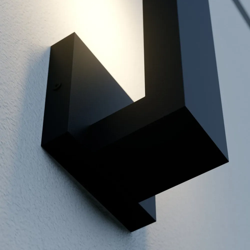 Lampekroppen på udendørslampen er konstrueret i en moderne form. Lampen er meget retlinet og geometrisk, og ser fra siden ud som et kæmpe stort L. Det fungerer rigtig godt f.eks. på en husfacade. De indbyggede LED’er er kraftfulde, energieffektive og varmehvide, og sidder bag en frostet glasrude på lampens bagside. De er således beskyttet mod al slags vind og vejr. De lyser på væggen i mørket og skaber et indirekte orienteringslys.