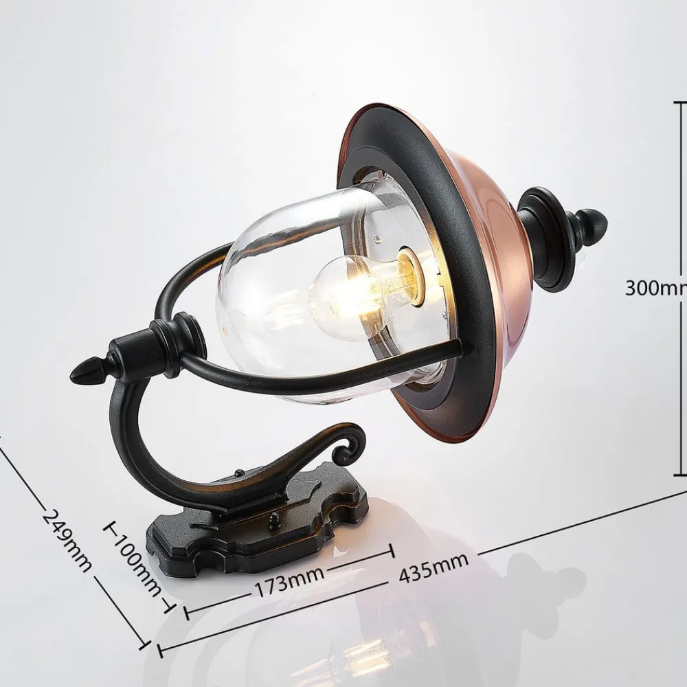 Den formskønne udendørs væglampe Clint består af et sort stel i aluminium, som kontrastfuldt suppleres med en kobberdel. Lampeskærmen ligner en stående lanterne, der er udstyret med et tag af kobber og en gennemsigtig skærm over E27-fatningen.