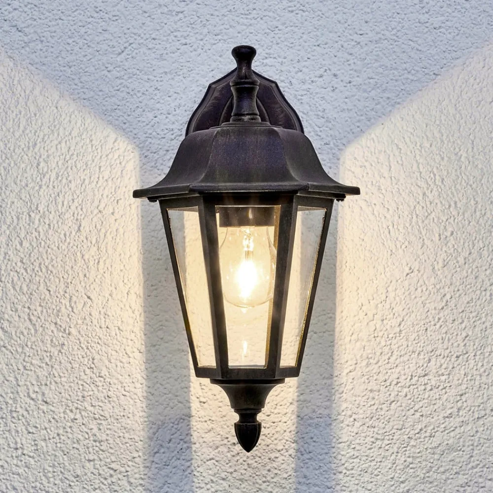 Lamina – udendørs væglampe med nostalgisk karakter Den nostalgiske skærm på denne udendørs væglampe, som kommer i en ret klassisk stil, er rettet nedad og er udstyret med en E27-pære. Der er et stort udvalg af pærer at vælge imellem, da markedet efterhånden har meget at byde på i denne henseende. Det er ikke kun de klassiske gløde- eller halogenpærer, der findes, men man kan også bruge de mere energieffektive LED- og sparepærer, som er meget mere skånsomme for pengepungen med hensyn til elforbrug. Den øverste del af den udendørs væglampe har en slags tag med seks glasruder i siderne, som lader lyset slippe uhindret ud takket være deres klare overflade og ikke tager noget af lysstyrken fra det.