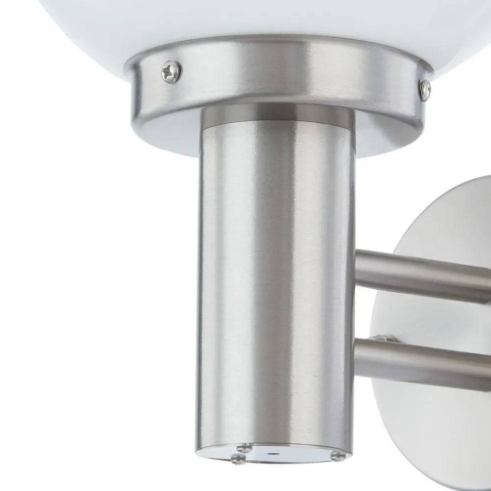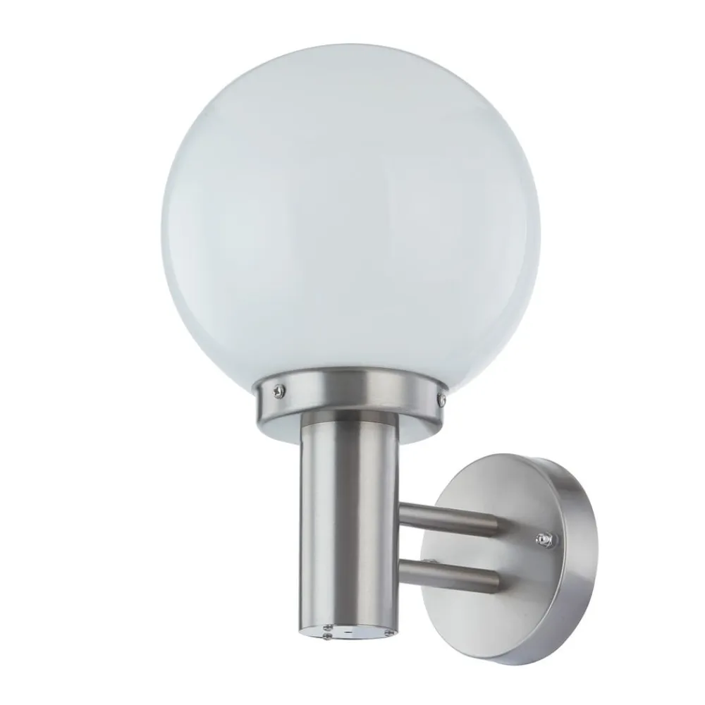 Nada har en opal hvid skærm i kugleformet glas og et stel i rustfrit stål. Den består af en rund vægbeslag og to smalle stivere, der peger mod den forreste del af stellet. Her munder det rustfri stålstelt ud i glaskuglen, der omslutter E27-pæren. Den opalhvide overflade giver en særlig blød lysfordeling, og den udendørs væglampe passer ikke kun til et moderne miljø, men ser også meget stilfuld ud, når den kombineres med et mere klassisk miljø.