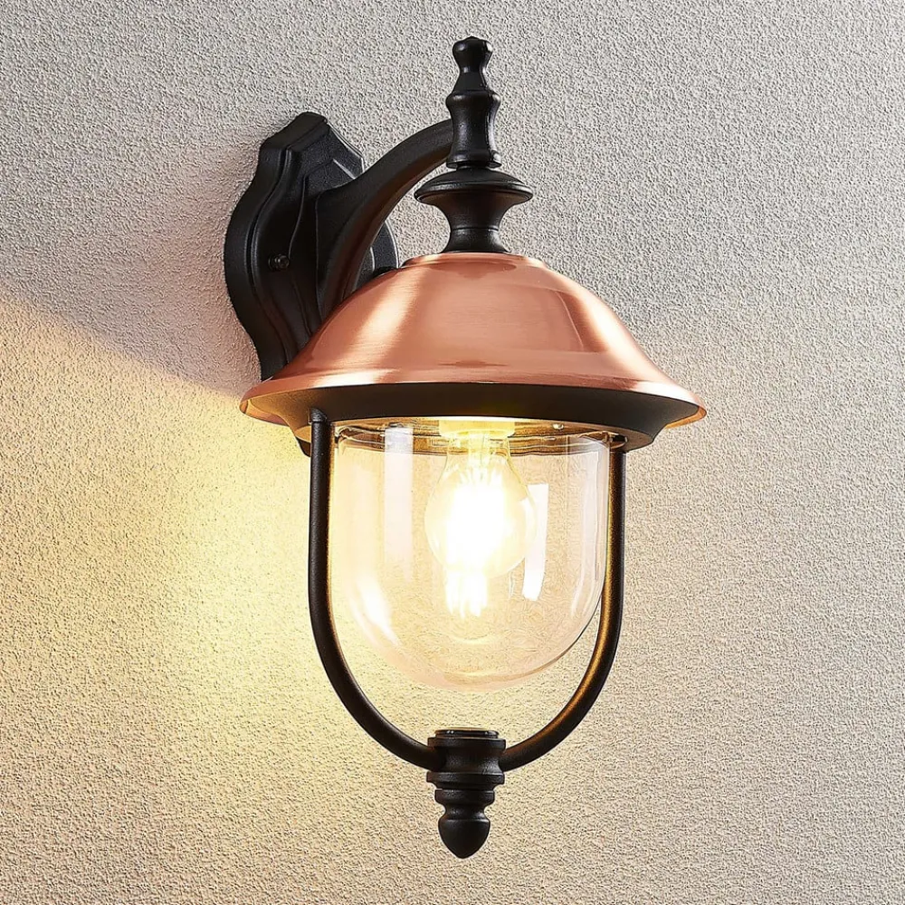 Takket være de anvendte materialer kan den formskønne udendørs væglampe Clint også bruges i nærheden af søer. Det sorte stel er lavet af aluminium, og den gennemsigtige lampeskærm er lavet af robust plast. Derudover har den et tag af kobber, som ikke kun skaber en smuk kontrast, men også bidrager til vejrbestandigheden. Udendørslampe Clint er med sit vintage-look helt på højde med tidens trend og overbeviser med sin smukke lanterneform. Anvendt ved indgangspartier, terrasser eller verandaer giver Clint-lampen ikke kun pålidelig og sikker belysning om aftenen, men pynter også smukt og imponerende i alle områder, selv i dagslys.