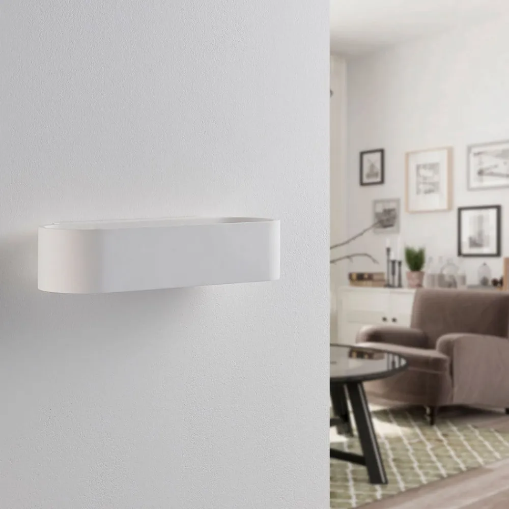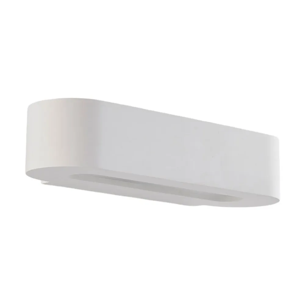Flot gipsvægslampe Fioni i hvid Fioni har en afrundet, oval form, som skaber et særligt harmonisk udtryk. Lyset skinner både opad og nedad, men lyskilden er næsten ikke synlig. Det betyder, at der ikke er noget blændende skær, og at helhedsindtrykket er hyggeligt. Hvis du vil tilpasse farven på den hvide overflade, kan du tage en pensel og male og designe den efter dine egne ideer.