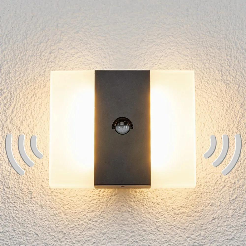 En bevægelsessensor er placeret i midten af udendørs LED-væglampe Kumi, direkte på den grafitgrå lakerede blænde. Denne sikrer, at lyset kun tændes, når personer nærmer sig væglampe og lyset faktisk er nødvendigt. På denne måde undgår man ubekvemt tænd og sluk, og Kumi lyser ikke unødigt, når der ikke er nogen til stede. Lampens kantede krop er lavet af hvid plast og sikrer, at der opstår et behageligt afskærmet lys.