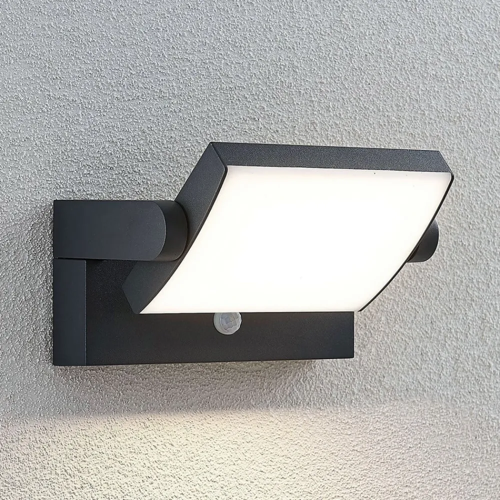 Udendørs væglampe Sherin har et moderne, lineært design. Det særlige highlight er den flade, kantede lampehoved, der kan drejes op til 340 grader, så både direkte og indirekte lys er muligt. Den indbyggede bevægelsessensor er også værd at nævne. Sensoren sidder i den nederste del af det mørkegrå stel og registrerer alle bevægelser inden for en rækkevidde på 4 til 6 meter og en registreringsvinkel på 100 grader. Lysets tændtid kan indstilles fra 5 sekunder til 6 minutter.