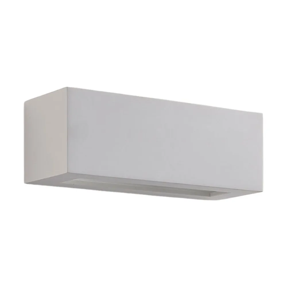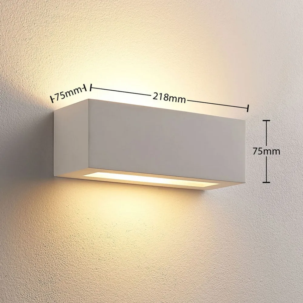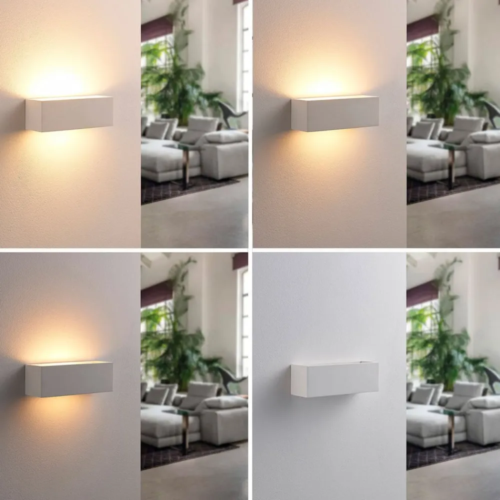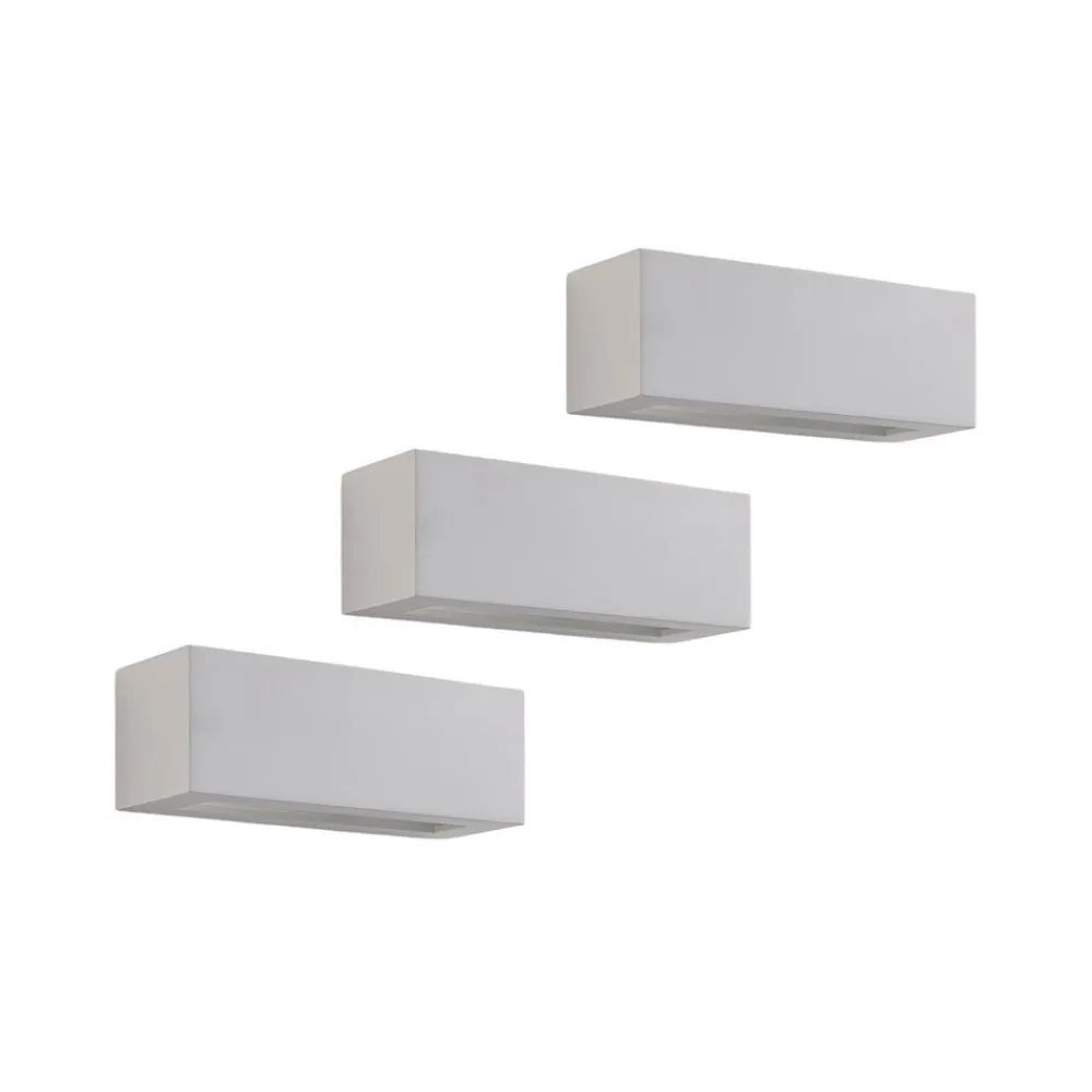 Tjada væglampe af gips med lineært design, pakke a 3 Tjada skaber et meget hyggeligt lys, som altid er velkomment i stuen, og kan her købes i en pakke a 3 stk. Overfladen på gipskroppen er hvid, men kan males eller farves, hvis det ønskes, hvilket betyder, at der også kan skabes mere individuelle designs. Lyset sendes både opad og nedad.