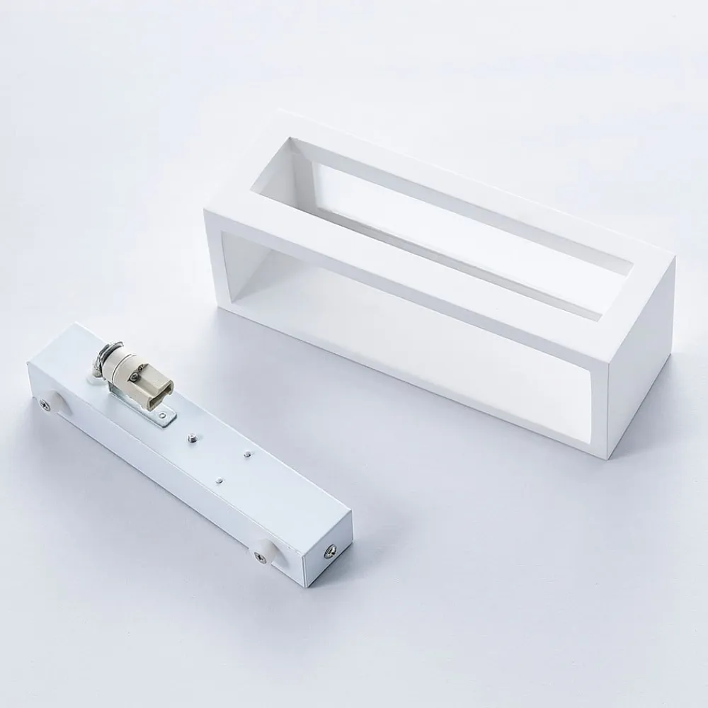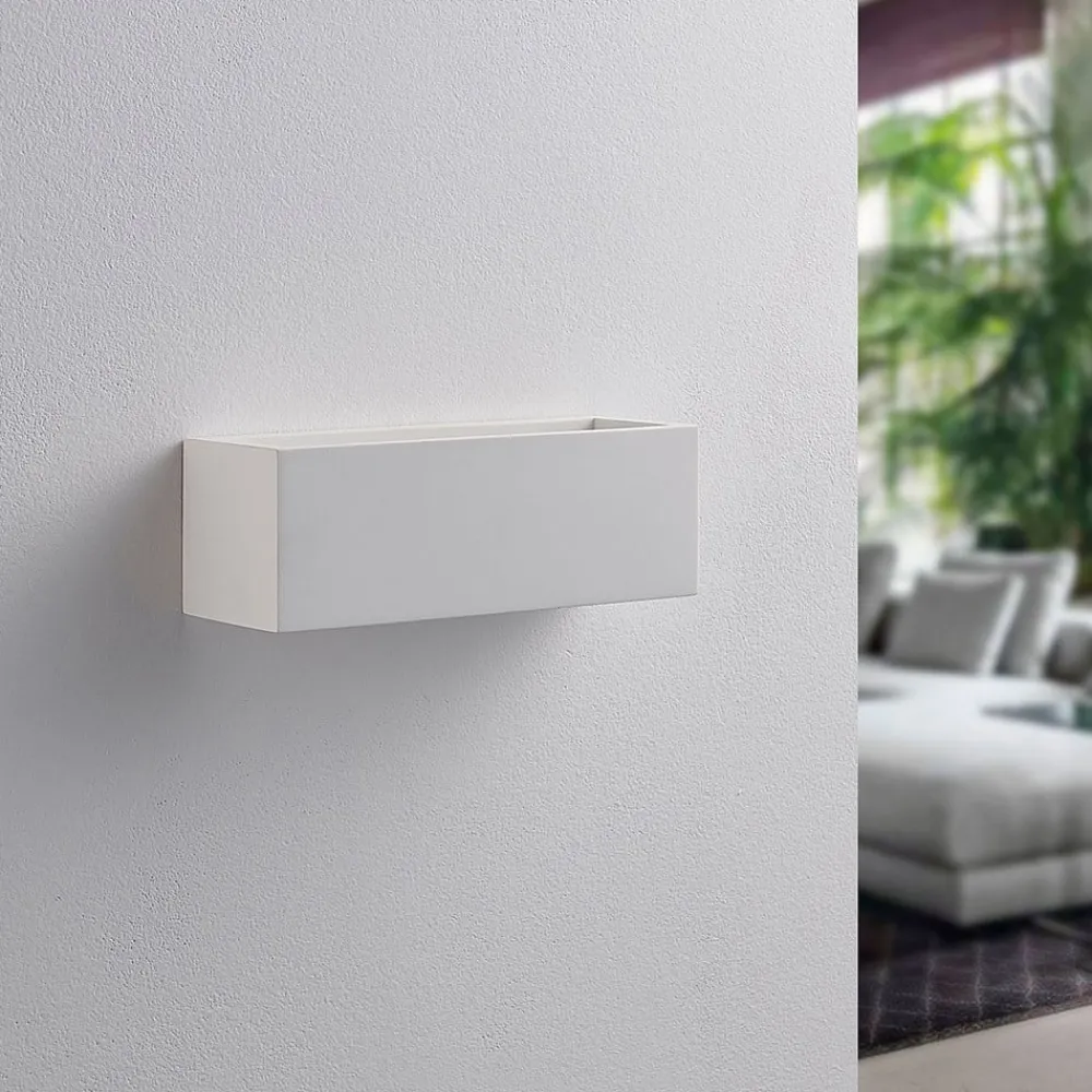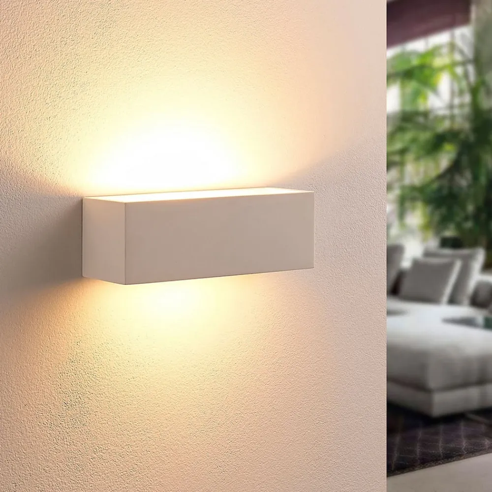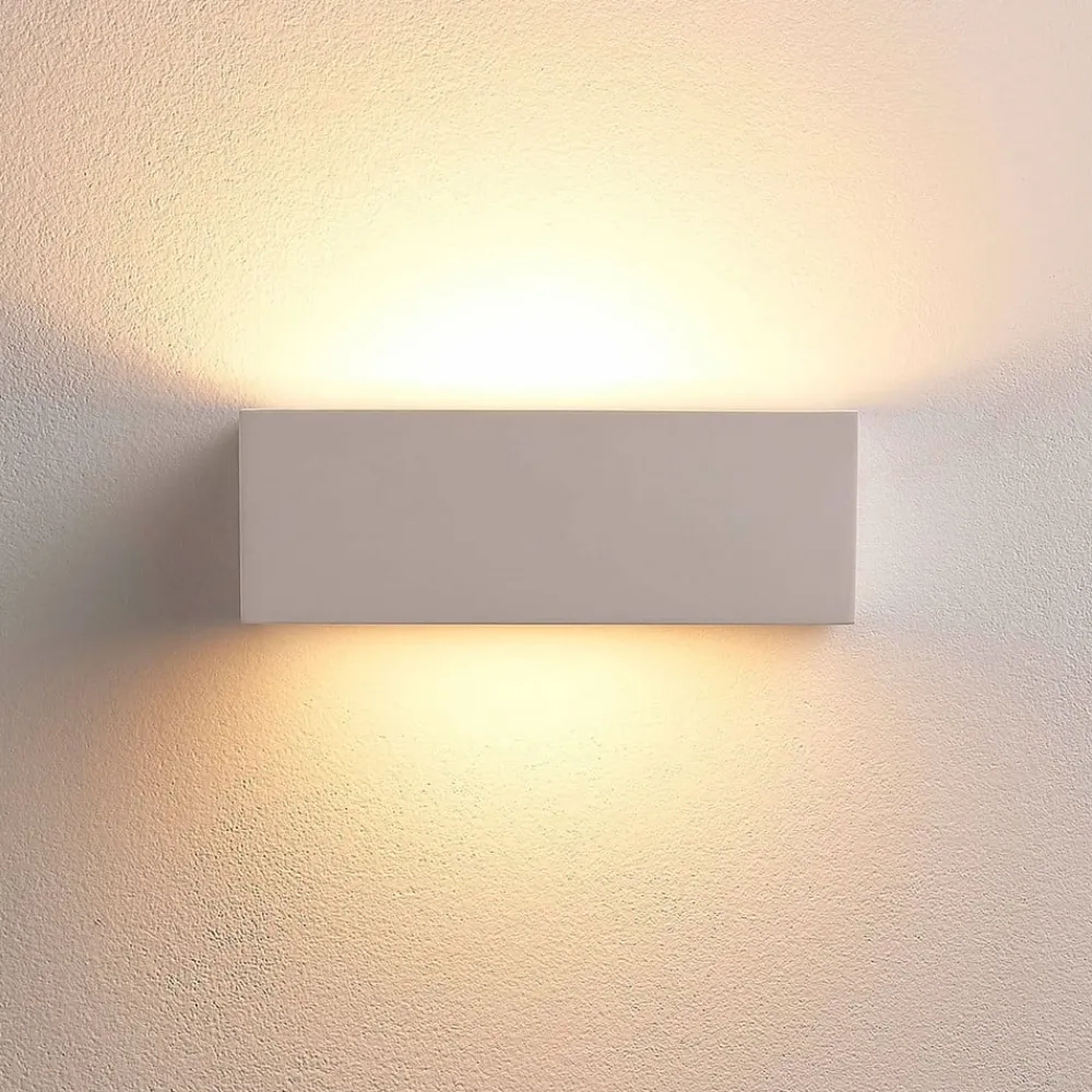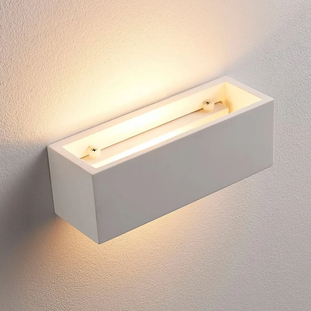 Tjada væglampe af gips med lineært design, pakke a 3 Tjada skaber et meget hyggeligt lys, som altid er velkomment i stuen, og kan her købes i en pakke a 3 stk. Overfladen på gipskroppen er hvid, men kan males eller farves, hvis det ønskes, hvilket betyder, at der også kan skabes mere individuelle designs. Lyset sendes både opad og nedad.