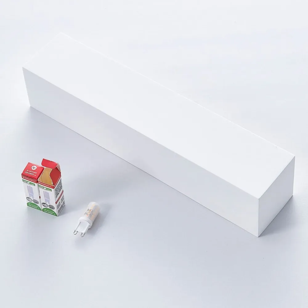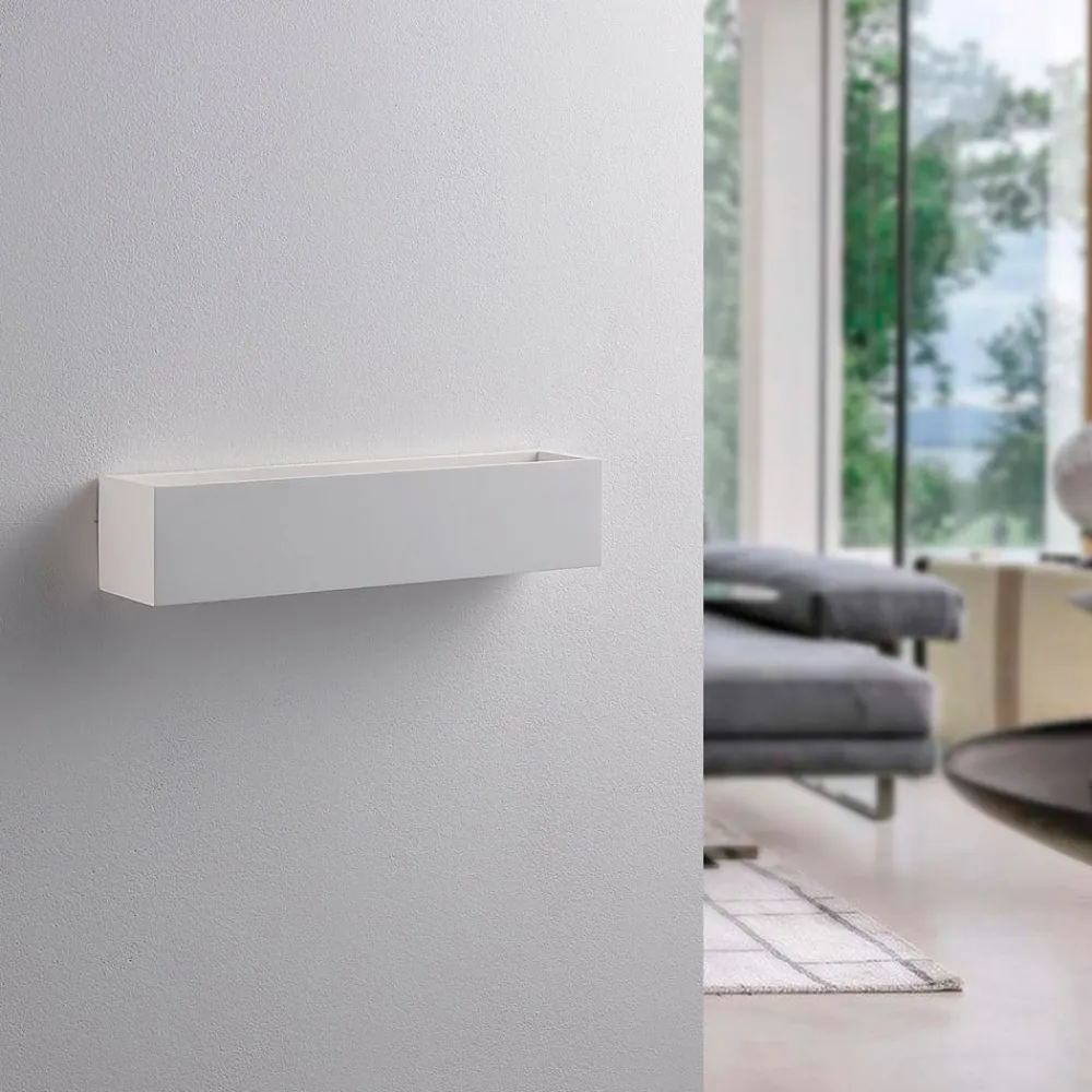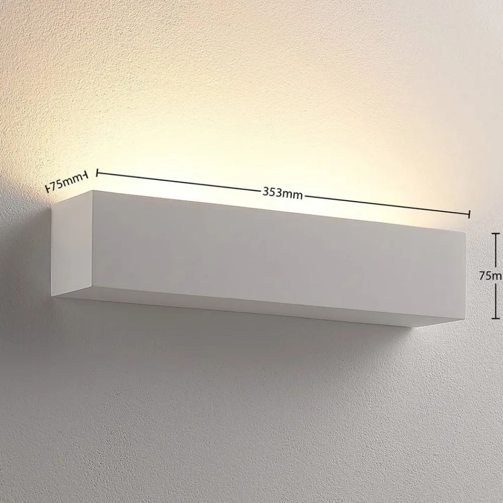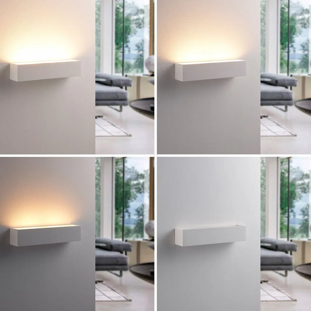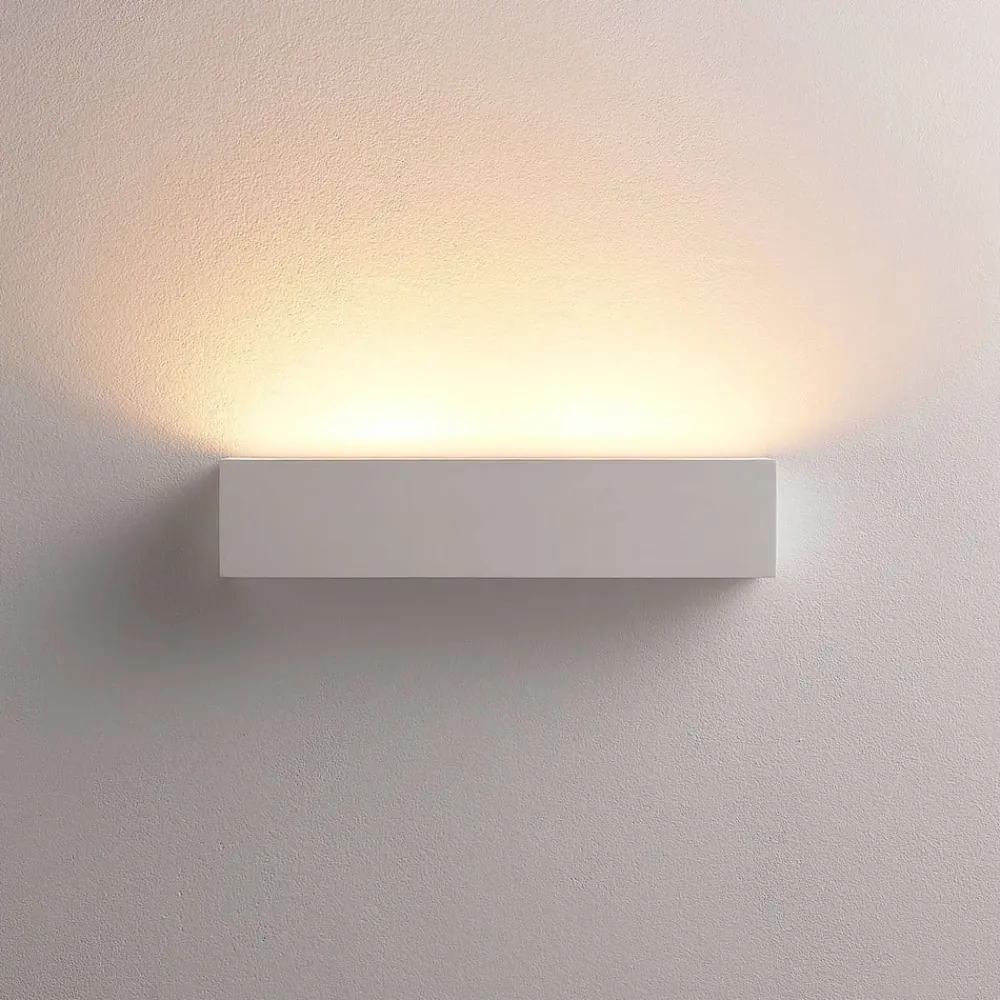 Kantet væglampe Santino med dæmpbar lampe Med sin kantede form er Santino en af de mest universelle lyskilder overhovedet, som kan bruges stort set uanset form og stil. Lyset sendes opad og skaber et varmt, indirekte lys, som næsten ikke kan blive mere hyggeligt. Hvis man ønsker det, kan man også male den hvide gipsoverflade eller dekorere den med et personligt motiv.