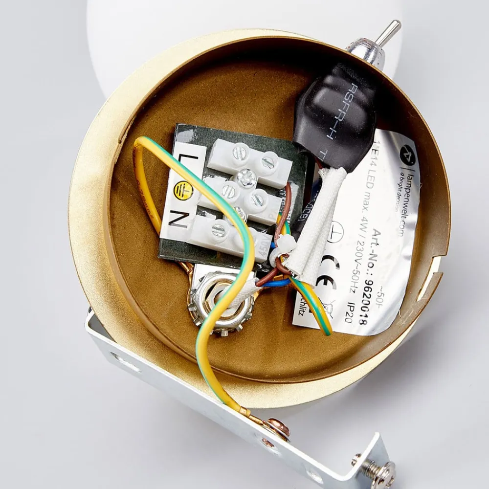 Messingfarvet Elaina-væglampe med E14-fatning Udstyret med en praktisk kontakt på undersiden af vægbeslaget kan Elaina-væglampen betjenes hurtigt og bekvemt. Det gør den til en populær lyskilde til montering over en seng eller sofa. Den kugleformede skærm er lavet af opalt glas, har kompakte dimensioner og suppleres af en klassisk udseende ramme med messingfinish.