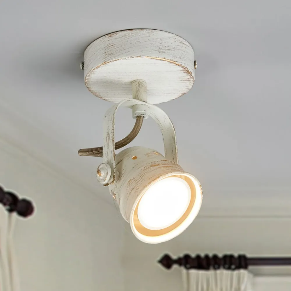 Antik udseende Leonor spot med justerbar metalskærm Dette er et armatur, der kan monteres på væggen eller i loftet. I begge tilfælde er det praktisk, at spottet kan justeres ved hjælp af leddene. Skærmens hvide overflade har et antikt look; nogle steder ser det ud, som om farven er skallet af metallet på grund af alderen. Et smukt brugt look til rum i vintagestil!