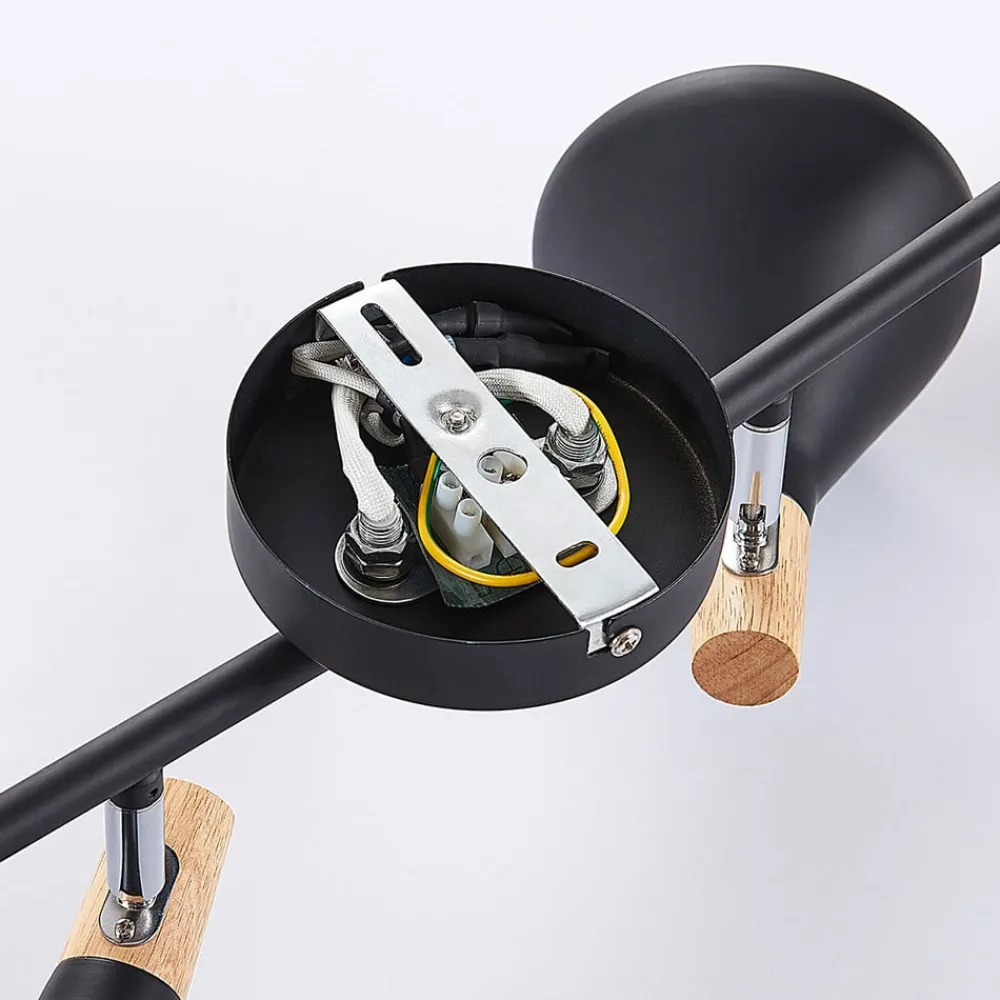 4 lyskilder Arina loftspot med sorte metalskærme og dekorative træapplikationer Dette loftspot har fire sorte metalskærme, som alle kan bevæges individuelt, så lysmønstret kan justeres optimalt. Øverst slutter skærmene med et træelement, der står i harmonisk kontrast til det sorte metal og bryder udseendet. Den 4 lyskilder version af loftspottet kan opnå god belysning og er især velegnet til køkkener og stuer, men også til alle andre rum.