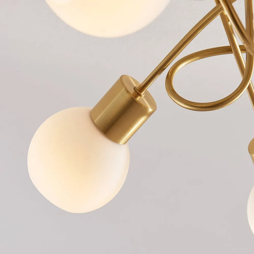 Klassisk udseende Elaina-loftlampe Elaina har en kompliceret udseende ramme med en attraktiv, klassisk udseende messingfinish. Loftlampens ramme suppleres af fem opalhvide glasskærme, som har en sfærisk form og er åbne foran. Der kan bruges energibesparende LED-loftlamper i dem, og lyset fremstår ensartet og hyggeligt, hvilket gør loftlampen lige velegnet til stue og soveværelse.